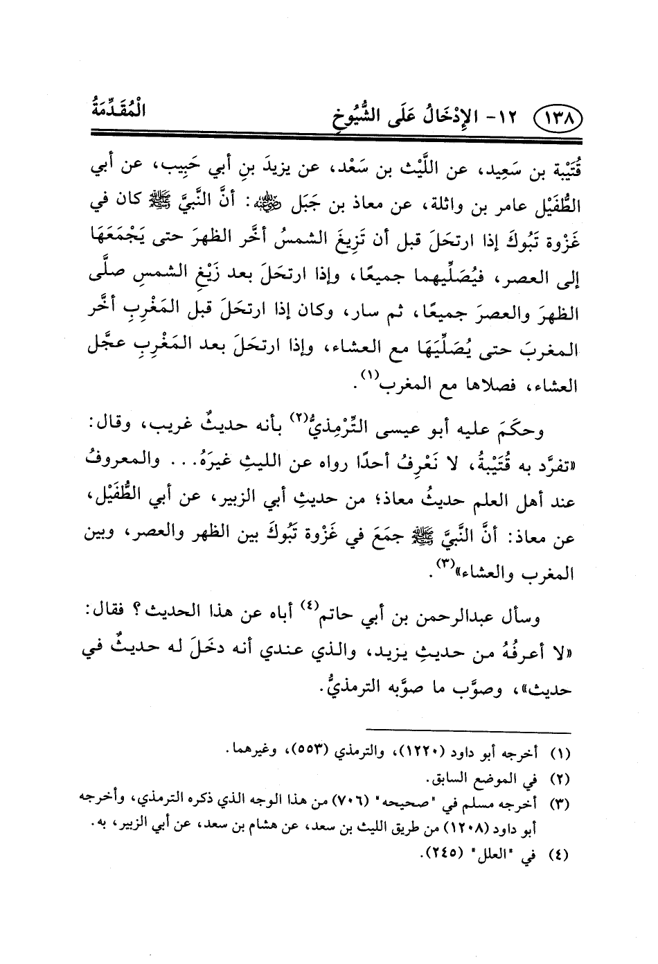 قُتَيْبة بْنُ سَعِيد، عَنِ اللَّيْث بْنِ سَعْد، عَنْ يزيدَ بنِ أَبِي حَبِيب، عَنْ أَبِي الطُّفَيْل عامر بن واثلة، عن معاذ بن جَبَل ح: أنَّ النَّبيَّ (ص) كان في غَزْوة تَبُوكَ إذا ارتحَلَ قبل أن تَزِيغَ الشمسُ أخَّر الظهرَ حتى يَجْمَعَهَا إلى العصر، فيُصَلِّيهما جميعًا، وإذا ارتحَلَ بعد زَيْغِ الشمسِ صلَّى الظهرَ والعصرَ جَمِيعًا، ثم سار، وكان إذا ارتحَلَ قبل المَغْرِبِ أخَّر المغربَ حتى يُصَلِّيَهَا مع العشاء، وإذا ارتحَلَ بعد المَغْرِبِ عجَّل العشاء، فصلاها مع المغرب (١) .