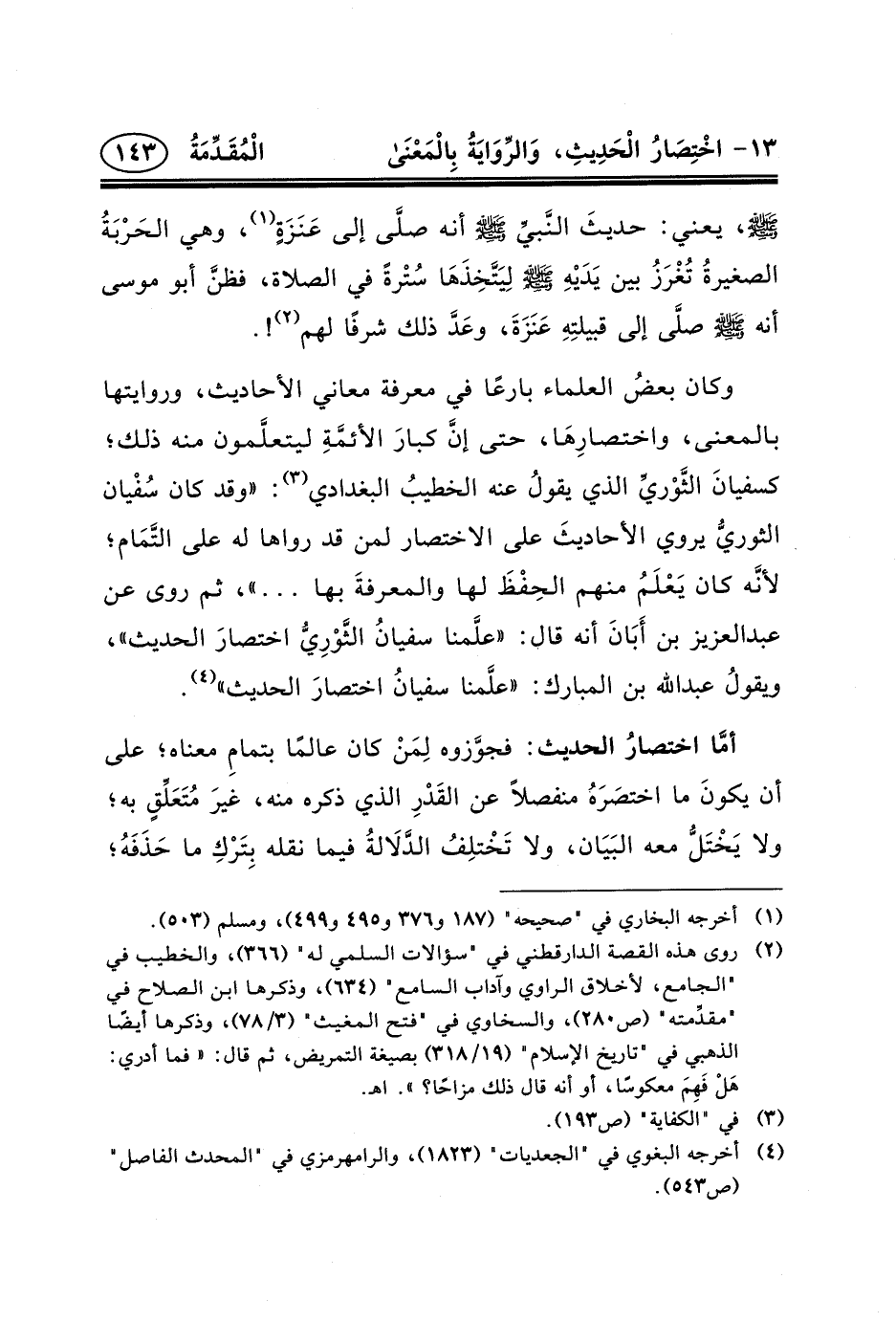 وكان بعضُ العلماء بارعًا في معرفة معاني الأحاديث، وروايتها بالمعنى، واختصارِهَا، حتى إنَّ كبارَ الأئمَّةِ ليتعلَّمون منه ذلك؛ كسفيانَ الثَّوْريِّ الذي يقولُ عنه الخطيبُ البغدادي (٣) : «وقد كان سُفْيان الثوريُّ يروي الأحاديثَ على الاختصار لمن قد رواها له على التَّمَام؛ لأنَّه كان يَعْلَمُ منهم الحِفْظَ لها والمعرفةَ بها ... » ، ثم روى عن عبد العزيز ابن أَبَانَ أنه قال: «علَّمنا سفيانُ الثَّوْرِيُّ اختصارَ الحديث» ، ويقولُ عبد الله بن المبارك: «علَّمنا سفيانُ اختصارَ الحديث» (٤) .