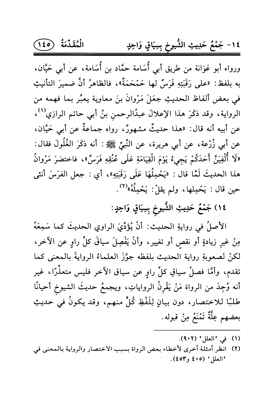 ورواه أبو عَوَانة من طريق أبي أُسَامة حمَّاد بن أُسَامة، عن أبي حَيَّان، به بلفظ: «على رَقَبَتِهِ فَرَسٌ لها حَمْحَمَةٌ» ، فالظاهرُ أنَّ ضميرَ التأنيثِ في بعض ألفاظ الحديثِ جعَلَ مَرْوانَ بنَ معاوية يعبِّر بما فهمه من الرواية، وقد ذكَرَ هذا الإعلالَ عبدُالرحمنِ بنُ أبي حاتم الرازي (١) ، عن أبيه أنه قال: «هَذَا حديثٌ مشهورٌ، رَوَاهُ جماعةٌ عَنْ أَبِي حَيَّان، عَنْ أَبِي زُرْعة، عَنْ أَبِي هُرَيْرَةَ، عَنِ النَّبيِّ (ص) : أَنَّهُ ذكَرَ الغُلُولَ فَقَالَ: «لَا أُلْفِيَنَّ أَحَدَكُمْ يَجِيءُ يَوْمَ الْقِيَامَةِ عَلَى عُنُقِهِ فَرَسٌ» ، فاختصَرَ مَرْوانُ هَذَا الحديثَ لَمَّا قَالَ: «يَحْمِلُهَا عَلَى رَقَبَتِهِ» ، أَيْ: جَعَلَ الفرَسَ أُنْثَى حِينَ قَالَ: يَحْمِلها، وَلَمْ يقلْ: يَحْمِلُهُ» (٢) .