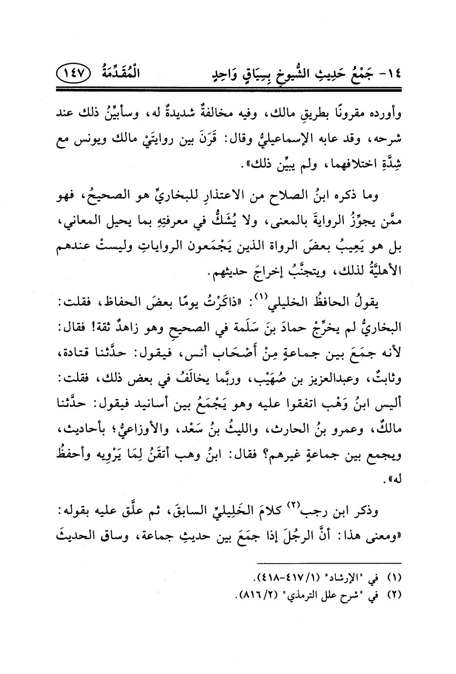وذكر ابن رجب (٢) كلامَ الخَلِيليِّ السابقَ، ثم علَّق عليه بقوله: «ومعنى هذا: أنَّ الرجُلَ إذا جمَعَ بين حديثِ جماعة، وساق الحديثَ