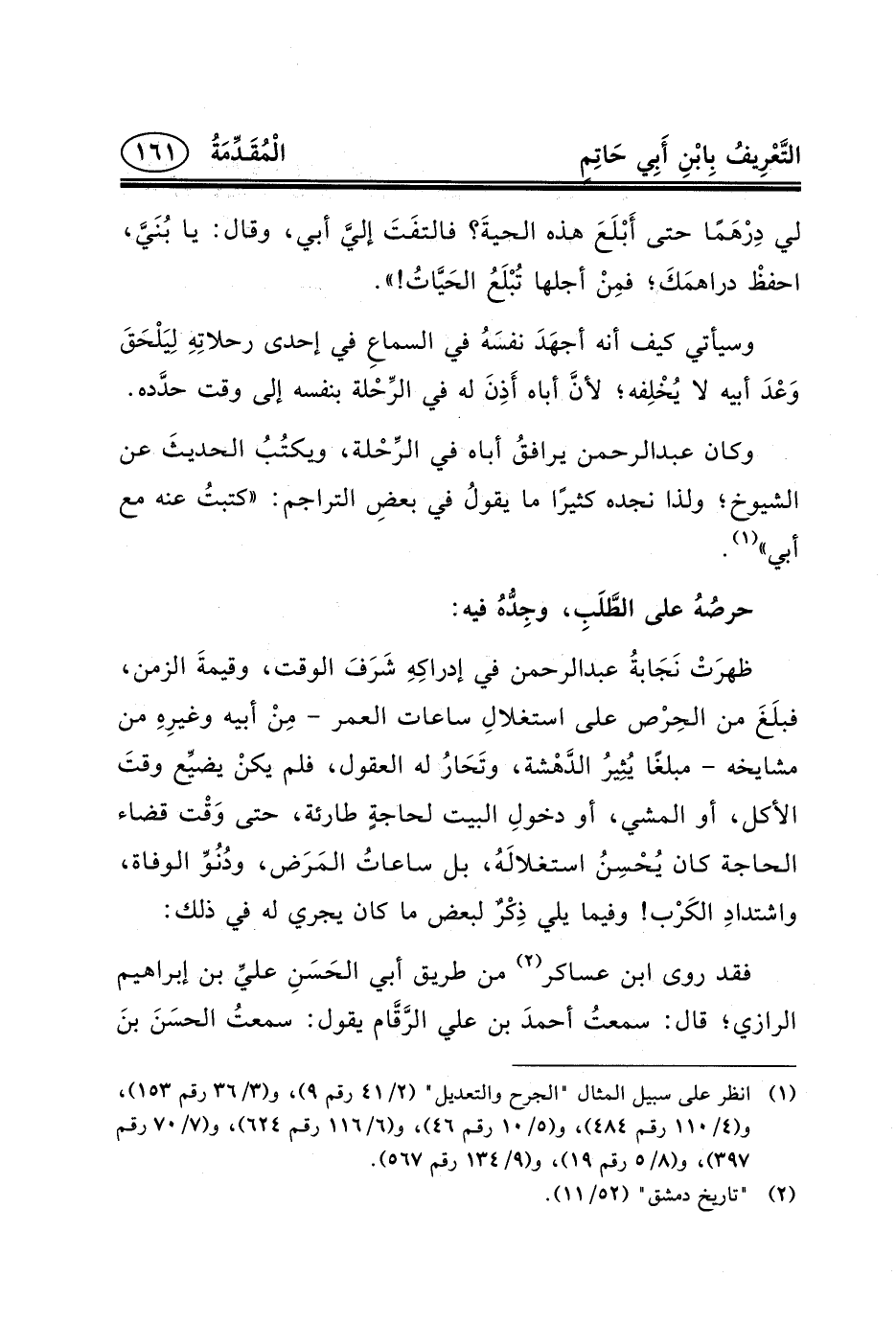 (١) انظر على سبيل المثال "الجرح والتعديل" (٢/٤١ رقم ٩) ، و (٣/٣٦ رقم ١٥٣) ، و (٤/١١٠ رقم ٤٨٤) ، و (٥/١٠ رقم ٤٦) ، و (٦/١١٦ رقم ٦٢٤) ، و (٧/٧٠ رقم ٣٩٧) ، و (٨/٥ رقم ١٩) ، و (٩/١٣٤ رقم ٥٦٧) .