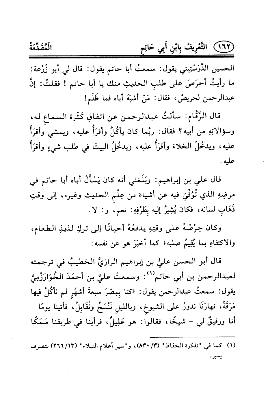 الحسين الدَّرَسْتِيني يقول: سمعتُ أبا حاتم يقول: قال لي أبو زُرْعة: ما رأيتُ أحرَصَ على طلبِ الحديثِ منك يا أبا حاتم! فقلتُ: إنَّ عبد الرحمن لحريصٌ، فقال: مَنْ أشبَهَ أباه فما ظَلَم!