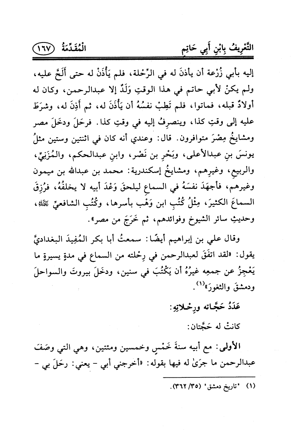 إليه بأبي زُرْعة أن يأذنَ له في الرِّحْلة، فلم يَأْذَنْ له حتى أَلَحَّ عليه، ولم يكنْ لأبي حاتم في هذا الوقتِ وَلَدٌ إلا عبد الرحمن، وكان له أولادٌ قبله، فماتوا، فلم تَطِبْ نفسُهُ أن يَأْذَنَ له، ثم أَذِنَ له، وشرَطَ عليه إلى وقتِ كذا، وينصرِفُ إليه في وقتِ كذا. فرحَلَ ودخَلَ مصر ومشايخُ مِصْرَ متوافرون. قال: وعندي أنه كان في اثنتين وستين مثلُ يونسَ بنِ عبد الأعلى، وبَحْرِ بن نَصْر، وابنِ عبد الحكم، والمُزَنِيِّ، والربيعِ، وغيرِهم، ومشايخُ إسكندرية: محمد بن عبد الله ابن ميمون وغيرهم، فأجهَدَ نفسَهُ في السماعِ ليلحقَ وَعْدَ أبيه لا يخلفُهُ، فرُزِقَ السماعَ الكثيرَ، مِثْلُ كُتُبِ ابن وَهْب بأسرها، وكُتُبِ الشافعيِّ _ح، وحديثِ سائر الشيوخ وفوائدهم، ثم خَرَجَ من مصر» .