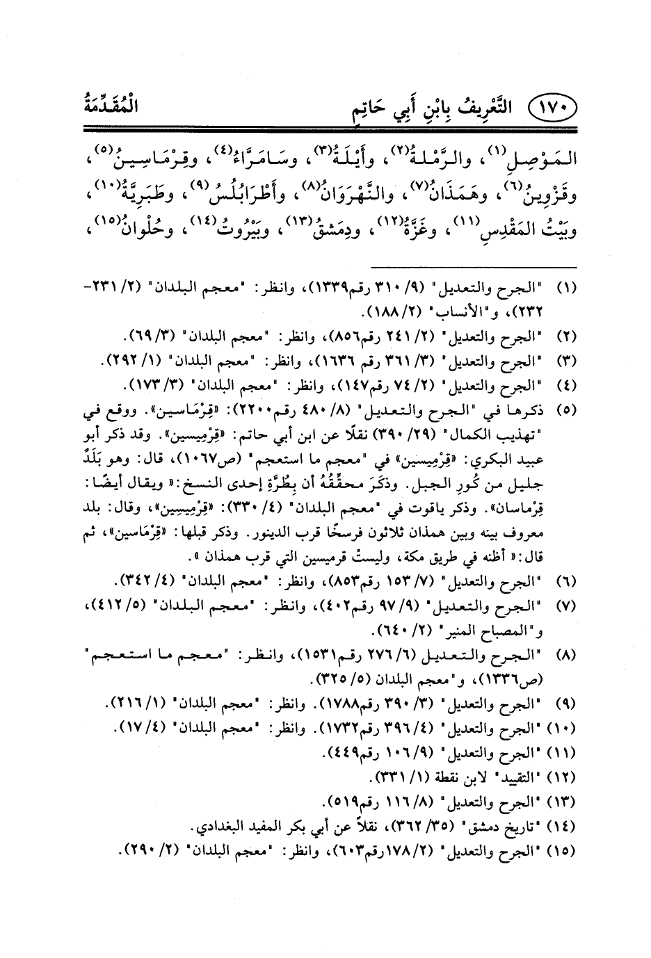 (٩) "الجرح والتعديل" (٣/٣٩٠ رقم١٧٨٨) . وانظر: "معجم البلدان" (١/٢١٦) .
