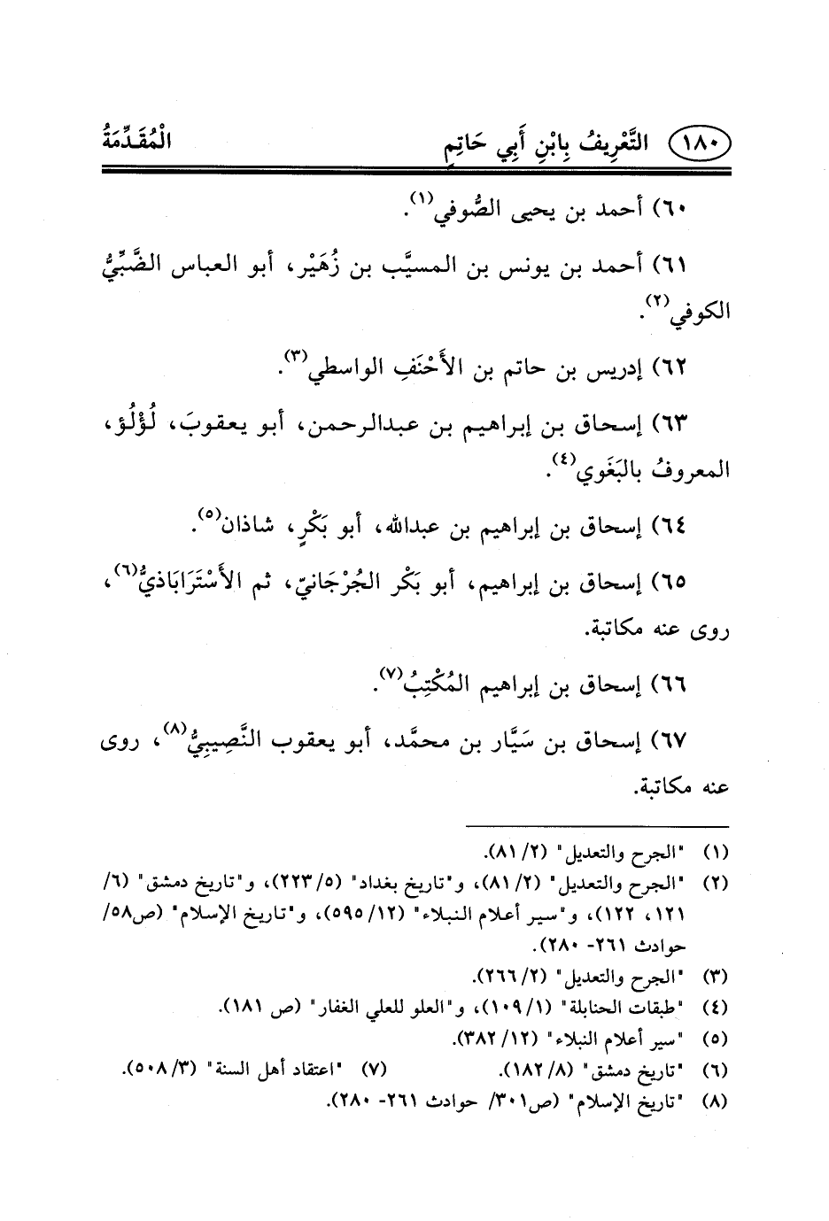 (٢) "الجرح والتعديل" (٢/٨١) ، و"تاريخ بغداد" (٥/٢٢٣) ، و"تاريخ دمشق" (٦/١٢١، ١٢٢) ، و"سير أعلام النبلاء" (١٢/٥٩٥) ، و"تاريخ الإسلام" (ص٥٨/ حوادث ٢٦١- ٢٨٠) .