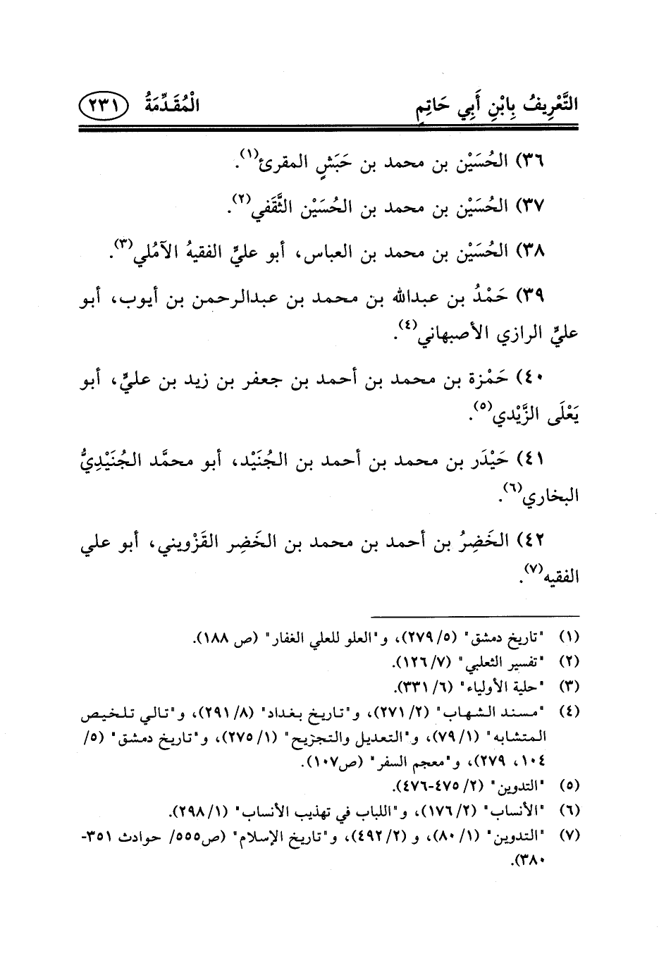 (٧) "التدوين" (١/٨٠) ، و (٢/٤٩٢) ، و"تاريخ الإسلام" (ص٥٥٥/ حوادث ٣٥١-٣٨٠) .