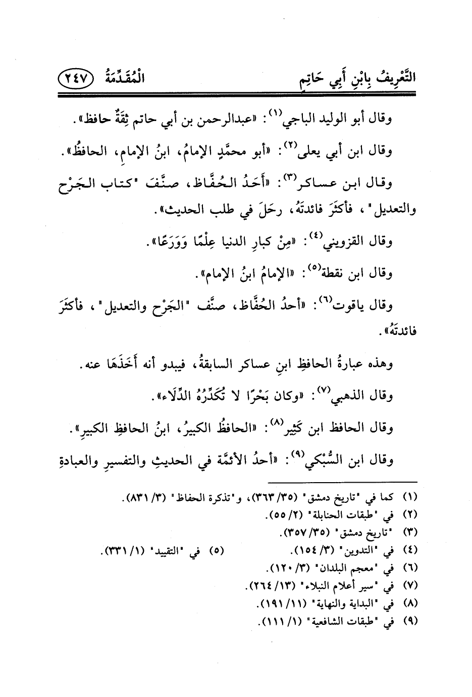 وقال أبو الوليد الباجي (١) : «عبد الرحمن ابن أبي حاتم ثِقَةٌ حافظ» .