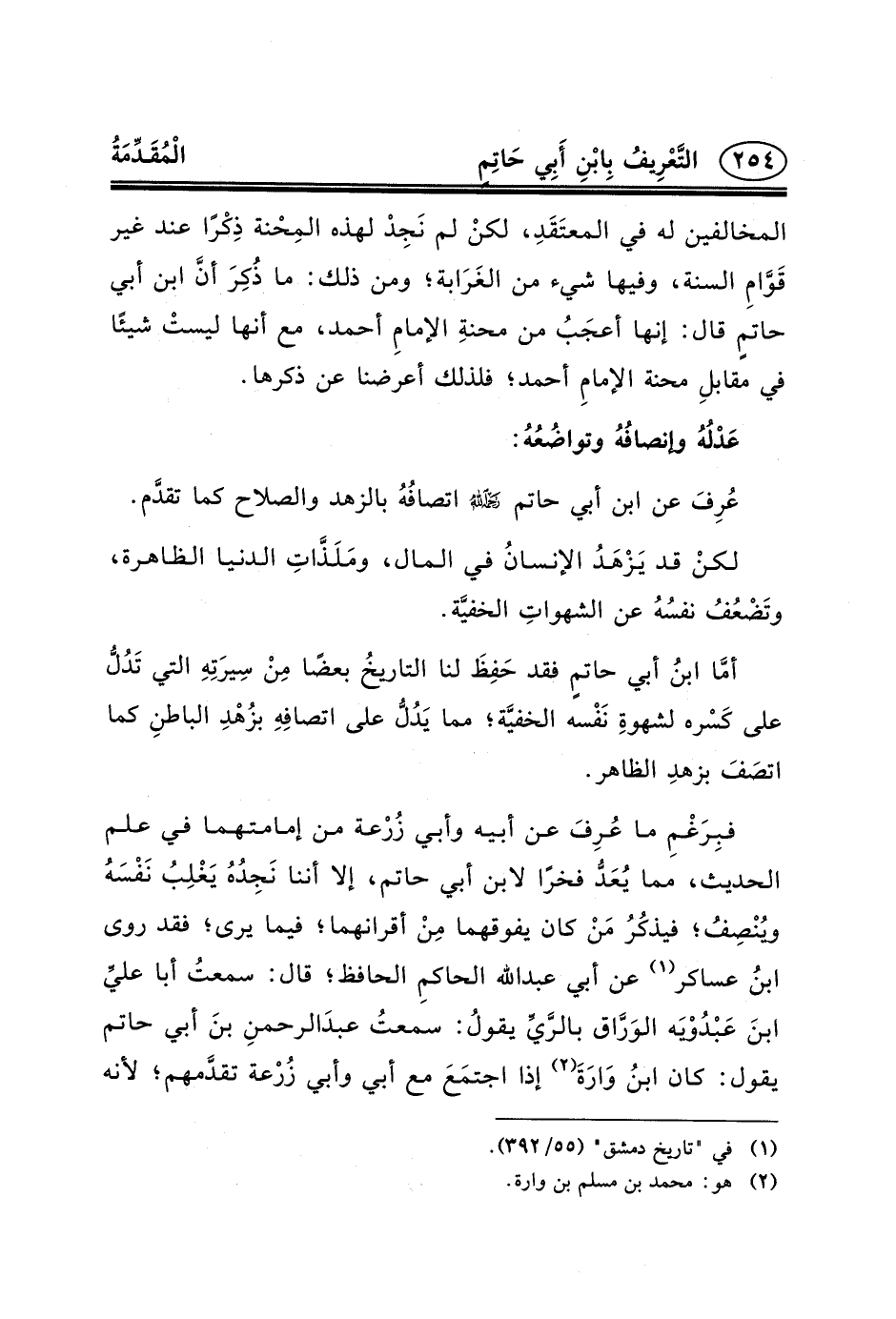 فبِرَغْمِ ما عُرِفَ عن أبيه وأبي زُرْعة من إمامتهما في علم الحديث، مما يُعَدُّ فخرًا لابن أبي حاتم، إلا أننا نَجِدُهُ يَغْلِبُ نَفْسَهُ ويُنْصِفُ؛ فيذكُرُ مَنْ كان يفوقهما مِنْ أقرانهما؛ فيما يرى؛ فقد روى ابنُ عساكر (١) عن أبي عبد الله الحاكمِ الحافظ؛ قال: سمعتُ أبا عليِّ بنَ عَبْدُوْيَه الوَرَّاق بالرَّيِّ يقولُ: سمعتُ عبدَالرحمنِ بنَ أبي حاتم يقول: كان ابنُ وَارَةَ (٢) إذا اجتمَعَ مع أبي وأبي زُرْعة تقدَّمهم؛ لأنه