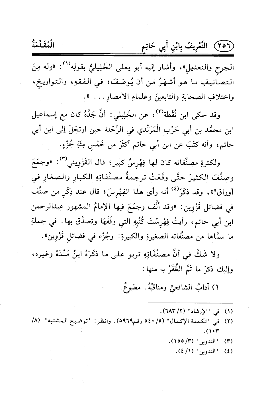 الجرحِ والتعديلِ» ، وأشار إليه أبو يعلى الخَلِيليُّ بقولِه (١) : «وله مِنَ التصانيفِ ما هو أشهَرُ من أن يُوصَفَ؛ في الفقهِ، والتواريخِ، واختلافِ الصحابةِ والتابعينَ وعلماءِ الأمصارِ ... » .