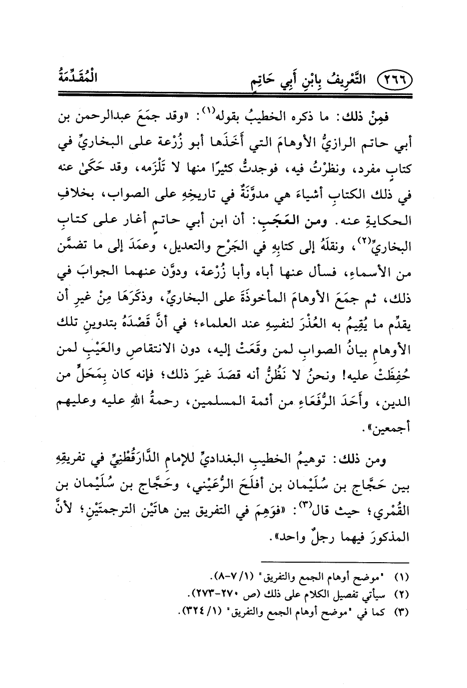 فمِنْ ذلك: ما ذكره الخطيبُ بقوله (١) : «وقد جمَعَ عبد الرحمن بن أبي حاتم الرازيُّ الأوهامَ التي أَخَذَها أبو زُرْعة على البخاريِّ في كتابٍ مفرد، ونظرْتُ فيه، فوجدتُّ كثيرًا منها لا تَلْزَمه، وقد حَكَى عنه في ذلك الكتابِ أشياءَ هي مدوَّنَةٌ في تاريخِهِ على الصواب، بخلافِ الحكايةِ عنه. ومن العَجَبِ: أن ابن أبي حاتمٍ أغار على كتابِ البخاريِّ (٢) ، ونقلَهُ إلى كتابِهِ في الجَرْح والتعديل، وعمَدَ إلى ما تضمَّن من الأسماءِ، فسأل عنها أباه وأبا زُرْعة، ودوَّن عنهما الجوابَ في ذلك، ثم جمَعَ الأوهامَ المأخوذَةَ على البخاريِّ، وذكَرَهَا مِنْ غيرِ أن يقدِّم ما يُقِيمُ به العُذْرَ لنفسِهِ عند العلماء؛ في أنَّ قَصْدَهُ بتدوينِ تلك الأوهامِ بيانُ الصوابِ لمن وقَعَتْ إليه، دون الانتقاصِ والعَيْبِ لمن حُفِظَتْ عليه! ونحنُ لا نَظُنُّ أنه قصَدَ غيرَ ذلك؛ فإنه كان بِمَحَلٍّ من الدين، وأَحَدَ الرُّفَعَاءِ من أئمة المسلمين، رحمةُ اللهِ عليه وعليهم أجمعين» .