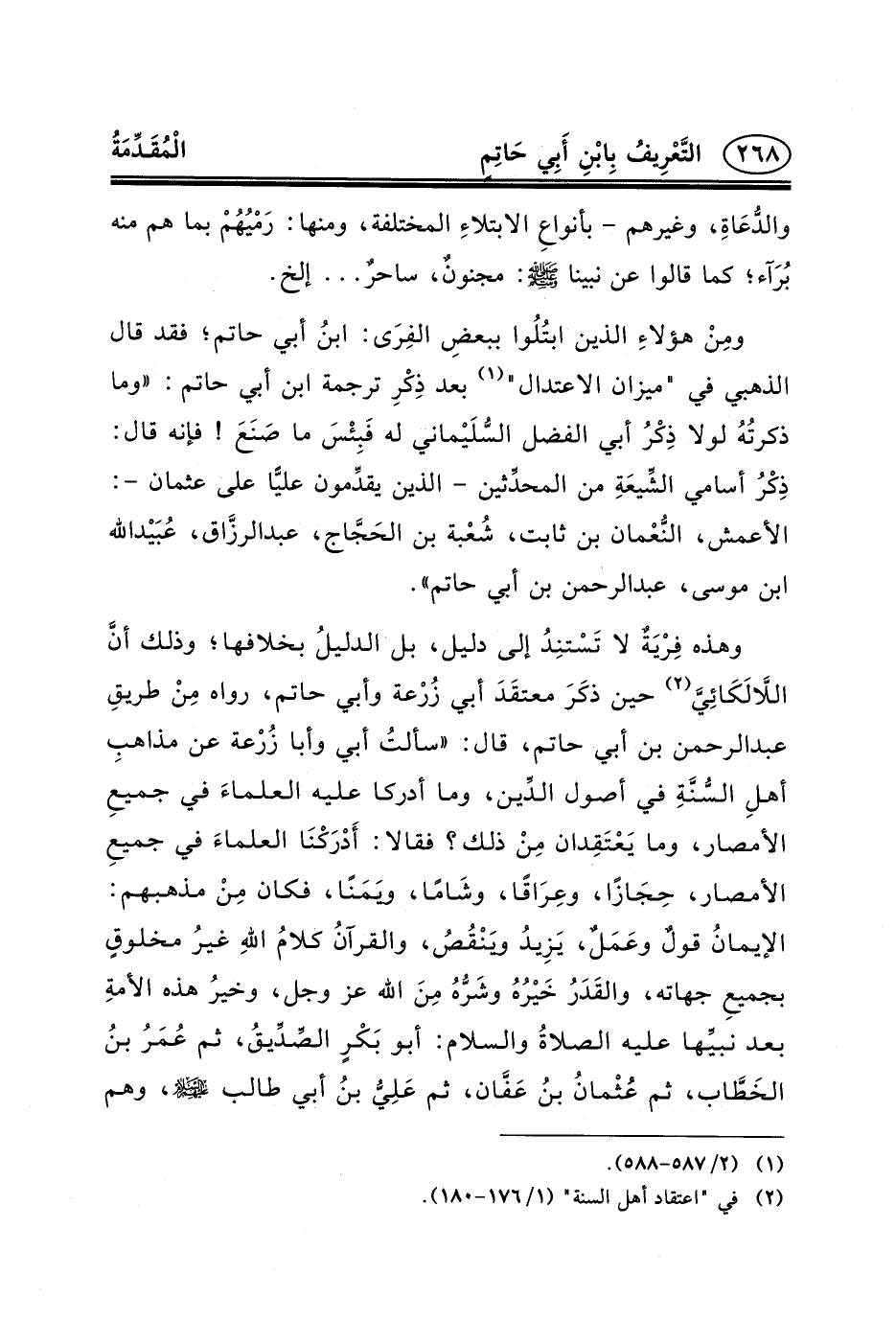 وهذه فِرْيَةٌ لا تَسْتنِدُ إلى دليل، بل الدليلُ بخلافها؛ وذلك أنَّ اللَاّلَكَائِيَّ (٢) حين ذكَرَ معتقَدَ أبي زُرْعة وأبي حاتم، رواه مِنْ طريقِ عبد الرحمن بْنِ أَبِي حَاتِمٍ، قَالَ: «سألتُ أبي وأبا زُرْعة عن مذاهبِ أهلِ السُّنَّةِ في أصول الدِّين، وما أدركا عليه العلماءَ في جميعِ الأمصار، وما يَعْتَقِدان مِنْ ذلك؟ فقالا: أَدْرَكْنَا العلماءَ في جميعِ الأمصار، حِجَازًا، وعِرَاقًا، وشَامًا، ويَمَنًا، فكان مِنْ مذهبهم: الإيمانُ قولٌ وعَمَلٌ، يَزِيدُ ويَنْقُصُ، والقرآنُ كلامُ اللهِ غيرُ مخلوقٍ بجميعِ جهاته، والقَدَرُ خَيْرُهُ وشَرُّهُ مِنَ الله عز وجل، وخيرُ هذه الأمةِ بعد نبيِّها عليه الصلاةُ والسلام: أبو بَكْرٍ الصِّدِّيقُ، ثم عُمَرُ بنُ الخَطَّاب، ثم عُثْمانُ بنُ عَفَّان، ثم عَلِيُّ بنُ أبي طالب _ت، وهم