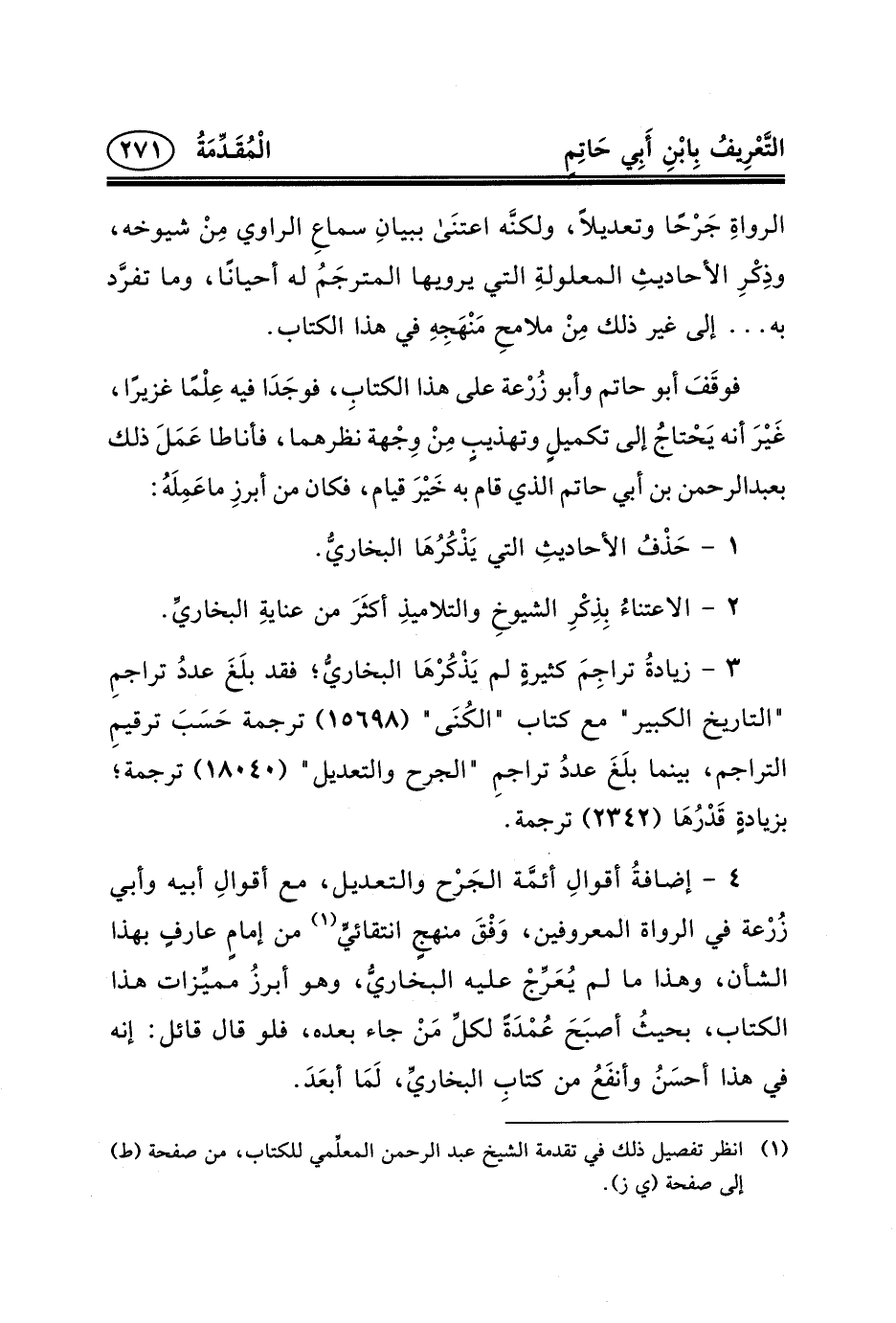 ٤ - إضافةُ أقوالِ أئمَّة الجَرْح والتعديل، مع أقوالِ أبيه وأبي زُرْعة في الرواة المعروفين، وَفْقَ منهجٍ انتقائيٍّ (١) من إمامٍ عارفٍ بهذا الشأن، وهذا ما لم يُعَرِّجْ عليه البخاريُّ، وهو أبرزُ مميِّزات هذا الكتاب، بحيثُ أصبَحَ عُمْدَةً لكلِّ مَنْ جاء بعده، فلو قال قائل: إنه في هذا أحسَنُ وأنفَعُ من كتابِ البخاريِّ، لَمَا أبعَدَ.