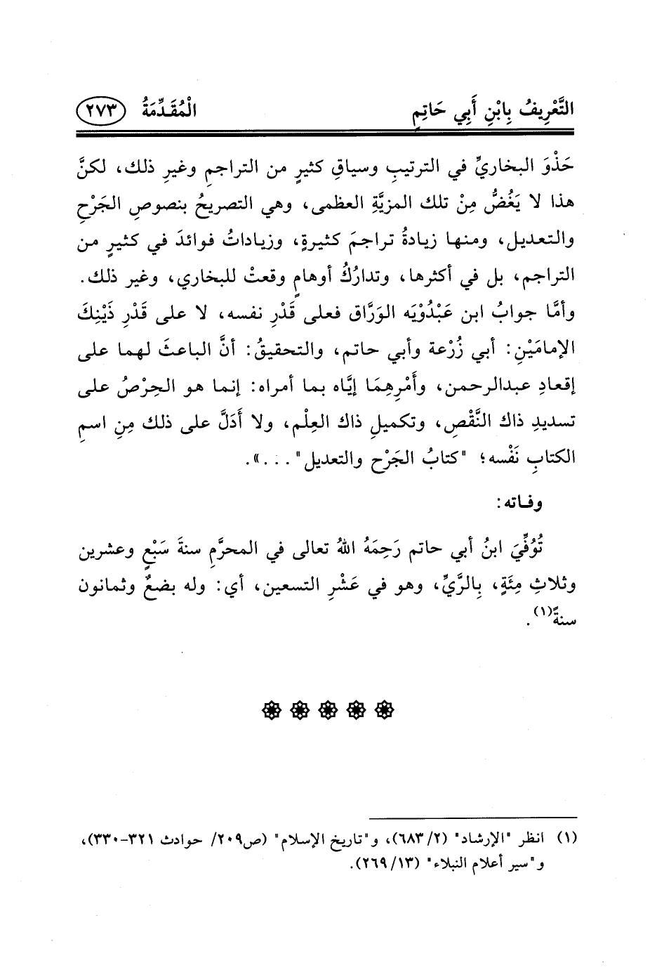 حَذْوَ البخاريِّ في الترتيبِ وسياقِ كثيرٍ من التراجمِ وغيرِ ذلك، لكنَّ هذا لا يَغُضُّ مِنْ تلك المزيَّةِ العظمى، وهي التصريحُ بنصوصِ الجَرْحِ والتعديل، ومنها زيادةُ تراجمَ كثيرةٍ، وزياداتُ فوائدَ في كثيرٍ من التراجم، بل في أكثرها، وتدارُكُ أوهامٍ وقعتْ للبخاري، وغير ذلك. وأمَّا جوابُ ابن عَبْدُوْيَه الوَرَّاق فعلى قَدْرِ نفسه، لا على قَدْرِ ذَيْنِكَ الإمامَيْنِ: أبي زُرْعة وأبي حاتم، والتحقيقُ: أنَّ الباعثَ لهما على إقعادِ عبد الرحمن، وأَمْرِهِمَا إيَّاه بما أمراه: إنما هو الحِرْصُ على تسديدِ ذاك النَّقْصِ، وتكميلِ ذاك العِلْم، ولا أَدَلَّ على ذلك مِنِ اسمِ الكتابِ نَفْسه؛ "كتابُ الجَرْح والتعديل" ... » .