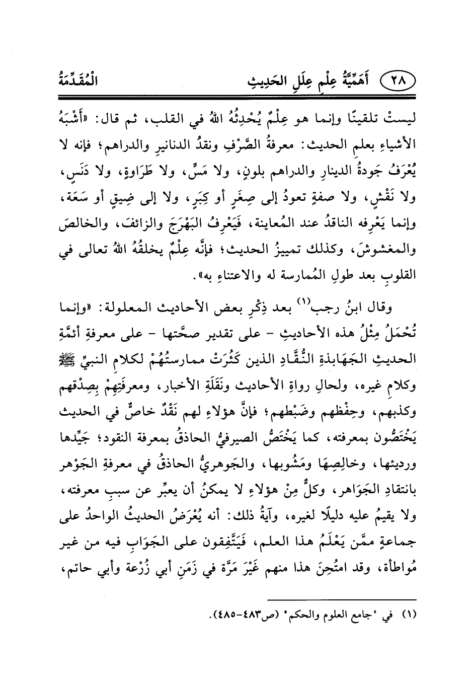 وقال ابنُ رجب (١) بعد ذِكْرِ بعض الأحاديث المعلولة: «وإنما تُحْمَلُ مِثْلُ هذه الأحاديثِ - على تقدير صحَّتها - على معرفةِ أئمَّةِ الحديثِ الجَهَابذةِ النُّقَّادِ الذين كَثُرَتْ ممارستُهُمْ لكلامِ النبيِّ (ص) وكلامِ غيره، ولحالِ رواةِ الأحاديث ونَقَلَةِ الأخبار، ومعرفَتِهِمْ بِصِدْقهم وكذبهم، وحِفْظهم وضَبْطهم؛ فإنَّ هؤلاءِ لهم نَقْدٌ خاصٌّ في الحديث يَخْتَصُّون بمعرفته، كما يَخْتَصُّ الصيرفيُّ الحاذقُ بمعرفة النقود؛ جَيِّدها ورديئها، وخالِصِهَا ومَشُوبها، والجَوهريُّ الحاذقُ في معرفةِ الجَوْهر بانتقادِ الجَوَاهر، وكلٌّ مِنْ هؤلاءِ لا يمكنُ أن يعبِّر عن سببِ معرفته، ولا يقيمُ عليه دليلاً لغيره، وآيةُ ذلك: أنه يُعْرَضُ الحديثُ الواحدُ على جماعةٍ ممَّن يَعْلَمُ هذا العلم، فَيَتَّفِقون على الجَوَابِ فيه من غير مُواطأة، وقد امتُحِنَ هذا منهم غَيْرَ مَرَّة في زَمَنِ أبي زُرْعة وأبي حاتم،