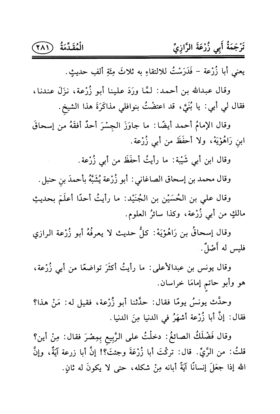 وقال الإمامُ أحمد أيضًا: ما جاوَزَ الجِسْرَ أحدٌ أفقَهُ من إسحاقَ ابنِ رَاهُوْيَهْ، ولا أحفَظَ من أبي زُرْعة.