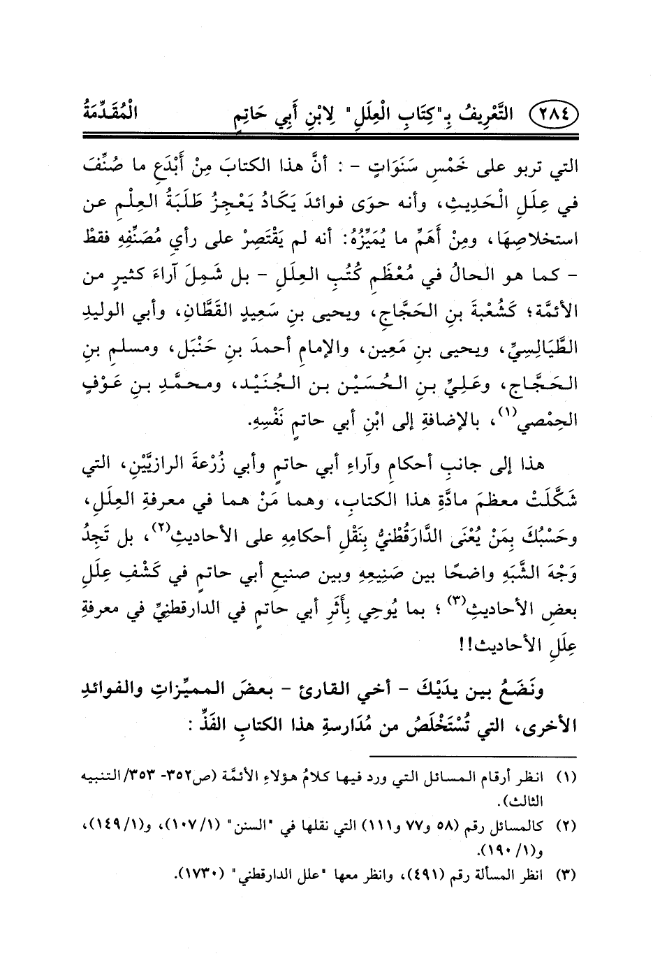 هذا إلى جانبِ أحكامِ وآراءِ أبي حاتمٍ وأبي زُرْعةَ الرازيَّيْنِ، التي شَكَّلَتْ معظمَ مادَّةِ هذا الكتابِ، وهما مَنْ هما في معرفةِ العِلَلِ، وحَسْبُكَ بِمَنْ يُعْنَى الدَّارَقُطْنيُّ بِنَقْلِ أحكامِهِ على الأحاديثِ (٢) ، بل تَجِدُ وَجْهَ الشَّبَهِ واضحًا بين صَنِيعِهِ وبين صنيعِ أبي حاتمٍ في كَشْفِ عِلَلِ بعضِ الأحاديثِ (٣) ؛ بما يُوحِي بِأَثَرِ أبي حاتمٍ في الدارقطنِيِّ في معرفةِ عِلَلِ الأحاديث!!
