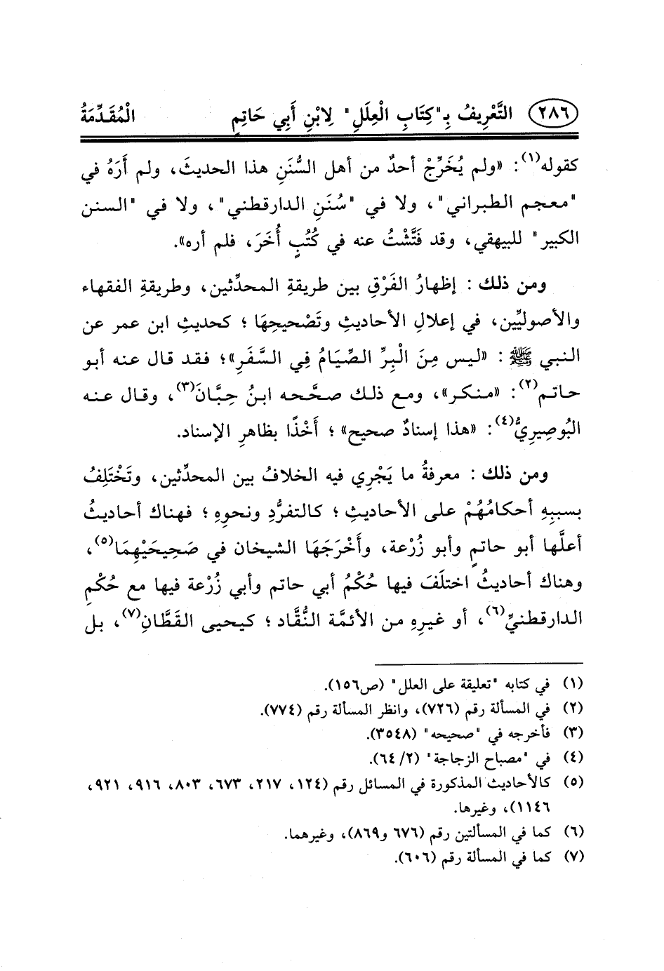 ومن ذلك: إظهارُ الفَرْقِ بين طريقةِ المحدِّثين، وطريقةِ الفقهاء والأصوليِّين، في إعلالِ الأحاديثِ وتَصْحيحِهَا؛ كحديثِ ابن عمر عن النبي (ص) : «لَيْسَ مِنَ الْبِرِّ الصِّيَامُ فِي السَّفَرِ» ؛ فقد قال عنه أبو حاتم (٢) : «منكر» ، ومع ذلك صحَّحه ابنُ حِبَّانَ (٣) ، وقال عنه البُوصِيرِيُّ (٤) : «هذا إسنادٌ صحيح» ؛ أَخْذًا بظاهرِ الإسناد.