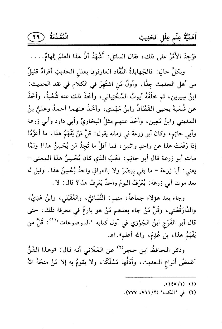 وبكلِّ حالٍ: فالجَهابذةُ النُّقَّاد العارفون بعللِ الحديثِ أفرادٌ قليلٌ من أهل الحديث جِدًّا، وأولُ مَنِ اشتُهِرَ في الكلام في نقد الحديث: ابنُ سِيرين، ثم خلَفَهُ أيوبُ السَّخْتِياني، وأخَذَ ذلك عنه شُعْبةُ، وأخَذَ عن شُعْبةَ يحيى القَطَّانُ وابنُ مَهْدي، وأخَذَ عنهما أحمدُ وعليُّ بنُ المَديني وابنُ مَعِين، وأخَذَ عنهم مثلُ البخاريِّ وأبي داود وأبي زرعة وأبي حاتِم، وكان أبو زرعة في زمانه يقول: قلَّ مَنْ يَفْهَمُ هذا، ما أعزَّهُ! إذا رَفَعْتَ هذا عن واحدٍ واثنين، فما أقلَّ ما تَجِدُ مَن يُحْسِنُ هذا! ولمَّا مات أبو زرعة قال أبو حاتِم: ذهَبَ الذي كان يُحْسِنُ هذا المعنى - يعني: أبا زرعة - ما بقي بِمِصْرَ ولا بالعراقِ واحدٌ يُحْسِنُ هذا. وقيل له بعد موت أبي زرعة: يُعْرَفُ اليومَ واحدٌ يَعْرِفُ هذا؟ قال: لا.