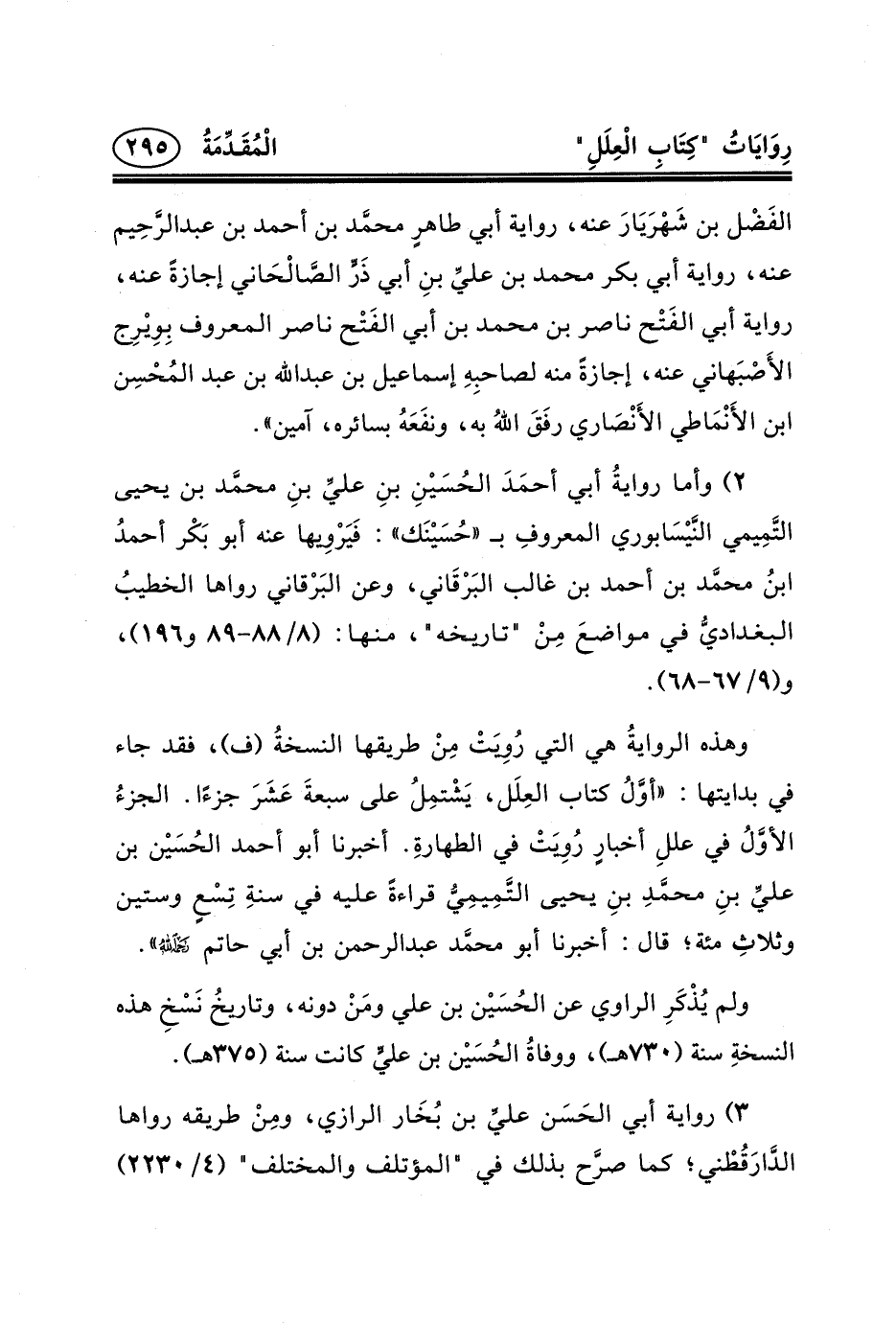 وهذه الروايةُ هي التي رُوِيَتْ مِنْ طريقها النسخةُ (ف) ، فقد جاء في بدايتها: «أوَّلُ كتاب العِلَل، يَشْتمِلُ عَلَى سبعةَ عَشَرَ جزءًا. الجزءُ الأوَّلُ فِي عللِ أخبارٍ رُوِيَتْ فِي الطهارةِ. أخبرنا أبو أحمد الحُسَيْن بن عليِّ بنِ محمَّدِ بنِ يحيى التَّمِيمِيُّ قراءة عَلَيْهِ فِي سنةِ تِسْعٍ وستين وثلاثِ مئة؛ قال: أخبرنا أبو محمَّد عبد الرحمن بن أبي حاتم _ح» .
