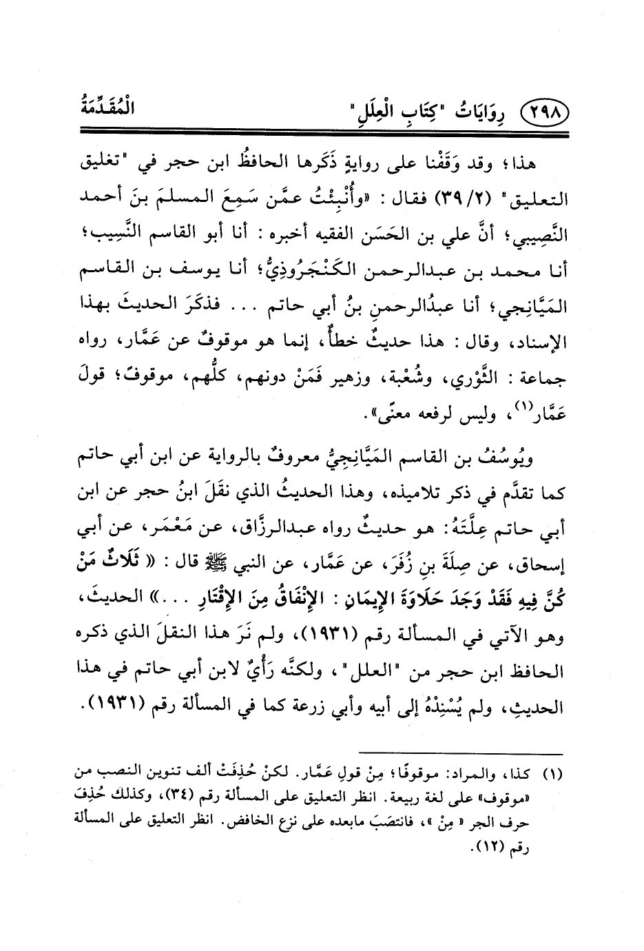 ويُوسُفُ بن القاسم المَيَّانِجِيُّ معروفٌ بالرواية عن ابن أبي حاتم كما تقدَّم في ذكر تلاميذه، وهذا الحديثُ الذي نقَلَ ابنُ حجر عن ابن أبي حاتم عِلَّتَهُ: هو حديثٌ رواه عبد الرزَّاق، عَنْ مَعْمَر، عَنْ أَبِي إِسْحَاقَ، عَنْ صِلَةَ بنِ زُفَرَ، عَنْ عَمَّار، عن النبي (ص) قال: ثَلَاثٌ مَنْ كُنَّ فِيهِ فَقَدْ وَجَدَ حَلَاوَةَ الإِيمَانِ: الإِنْفَاقُ مِنَ الإِقْتَارِ ... الحديثَ، وهو الآتي في المسألة رقم (١٩٣١) ، ولم نَرَ هذا النقلَ الذي ذكره الحافظ ابن حجر من "العلل"، ولكنَّه رَأْيٌ لابن أبي حاتم في هذا الحديثِ، ولم يُسْنِدْهُ إلى أبيه وأبي زرعة كما في المسألة رقم (١٩٣١) .