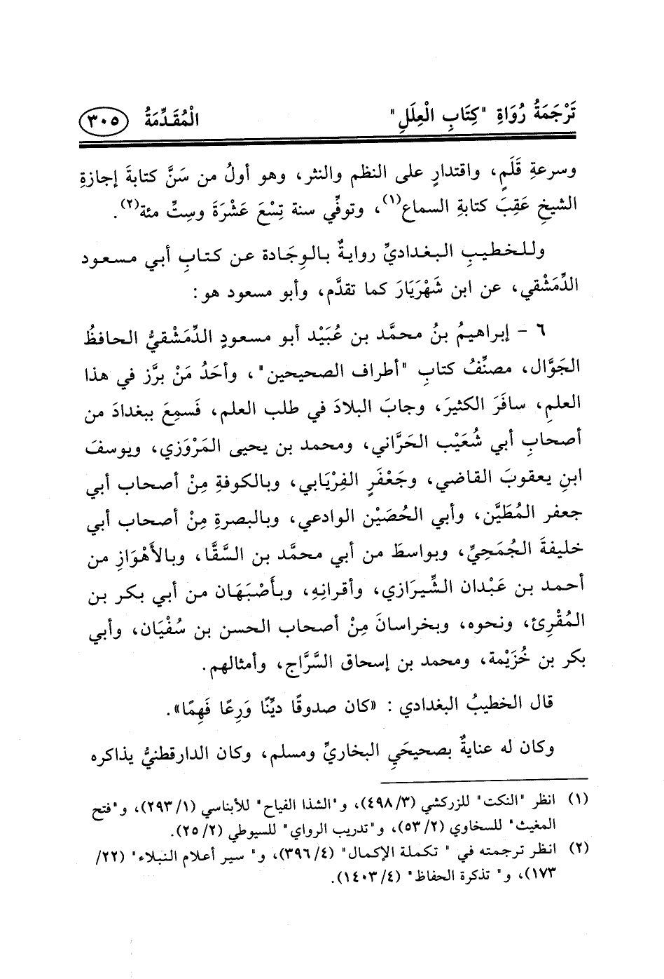 ٦ - إبراهيمُ بنُ محمَّد بْنِ عُبَيْد أبو مسعودٍ الدِّمَشْقيُّ الحافظُ الجَوَّال، مصنِّفُ كتابِ "أطراف الصحيحين"، وأحَدُ مَنْ برَّز في هذا العلمِ، سافَرَ الكثيرَ، وجابَ البلادَ في طلب العلم، فَسمِعَ ببغدادَ من أصحابِ أبي شُعَيْب الحَرَّاني، ومحمد بن يحيى المَرْوَزي، ويوسفَ ابنِ يعقوبَ القاضي، وجَعْفَرٍ الفِرْيَابي، وبالكوفةِ مِنْ أصحاب أبي جعفر المُطَيَّن، وأبي الحُصَيْن الوادعي، وبالبصرةِ مِنْ أصحاب أبي خليفةَ الجُمَحِيِّ، وبواسطَ من أبي محمَّد ابن السَّقَّا، وبالأَهْوَازِ من أحمد بن عَبْدان الشِّيرَازي، وأقرانِهِ، وبأَصْبَهَان من أبي بكر بن المُقْرِئ، ونحوه، وبخراسانَ مِنْ أصحاب الحسن بن سُفْيَان، وأبي بكر بن خُزَيْمة، ومحمد بن إسحاق السَّرَّاج، وأمثالهم.
