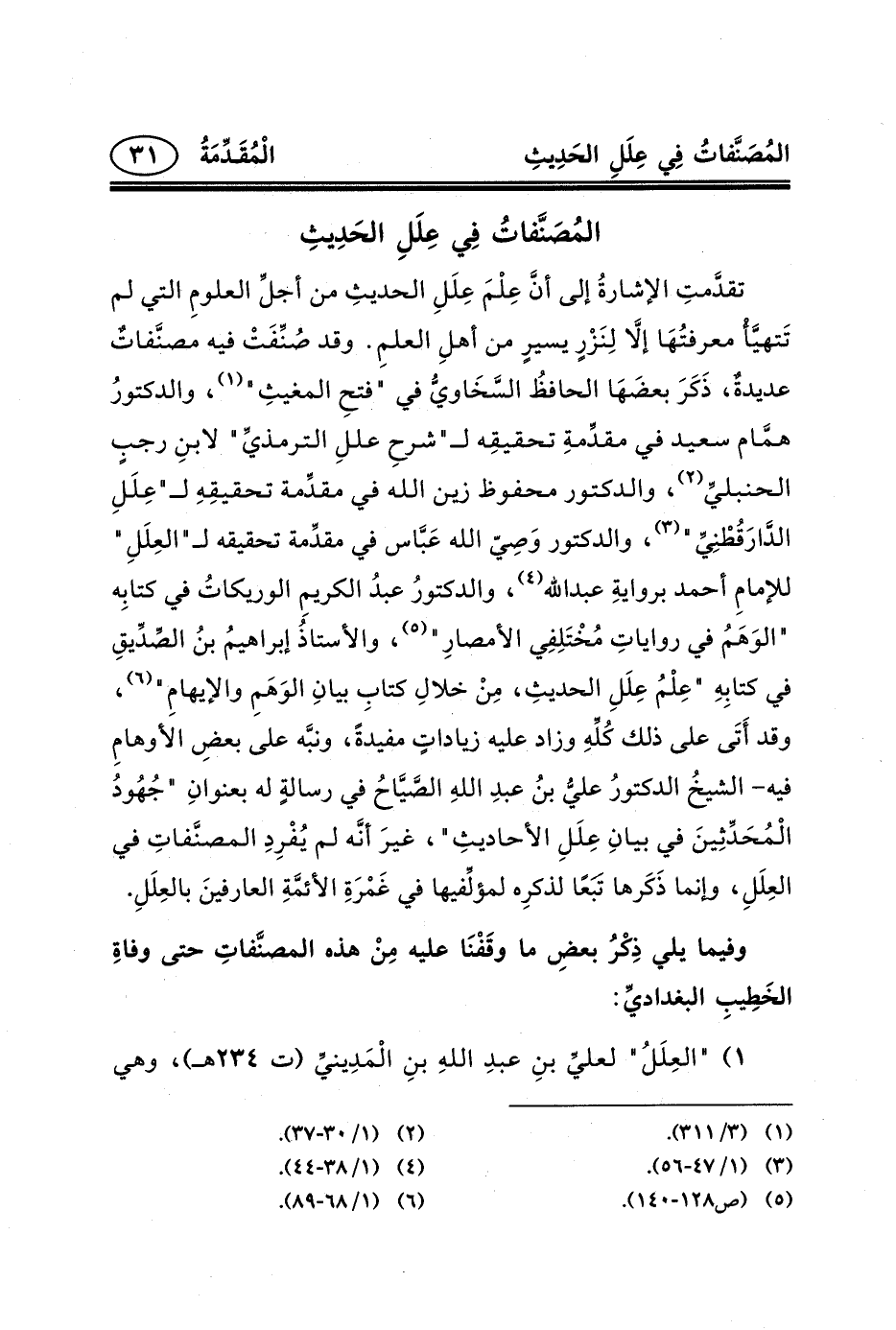 تقدَّمتِ الإشارةُ إلى أنَّ عِلْمَ عِلَلِ الحديثِ من أجلِّ العلومِ التي لم تَتهيَّأْ معرفتُهَا إلَاّ لِنَزْرٍ يسيرٍ من أهلِ العلمِ. وقد صُنِّفَتْ فيه مصنَّفاتٌ عديدةٌ، ذَكَرَ بعضَهَا الحافظُ السَّخَاويُّ في "فتحِ المغيثِ" (١) ، والدكتورُ همَّام سعيد في مقدِّمةِ تحقيقِه لـ"شرحِ عللِ الترمذيِّ" لابنِ رجبٍ الحنبليِّ (٢) ، والدكتور محفوظ زين الله في مقدِّمة تحقيقِهِ لـ"عِلَلِ الدَّارَقُطْنِيِّ" (٣) ، والدكتور وَصِيّ الله عَبَّاس في مقدِّمة تحقيقه لـ"العِلَلِ" للإمامِ أحمد بروايةِ عبد الله (٤) ، والدكتورُ عبدُ الكريمِ الوريكاتُ في كتابِه "الوَهَمُ في رواياتِ مُخْتَلِفِي الأمصارِ" (٥) ، والأستاذُ إبراهيمُ بنُ الصِّدِّيقِ في كتابِهِ "عِلْمُ عِلَلِ الحديثِ، مِنْ خلالِ كتابِ بيانِ الوَهَمِ والإيهامِ" (٦) ، وقد أَتَى على ذلك كُلِّهِ وزاد عليه زياداتٍ مفيدةً، ونبَّه على بعضِ الأوهامِ فيه- الشيخُ الدكتورُ عليُّ بنُ عبدِ اللهِ الصَّيَّاحُ في رسالةٍ له بعنوانِ "جُهُودُ الْمُحَدِّثِينَ في بيانِ عِلَلِ الأحاديثِ"، غيرَ أنَّه لم يُفْرِدِ المصنَّفاتِ في العِلَلِ، وإنما ذَكَرها تَبَعًا لذكرِه لمؤلِّفيها في غَمْرَةِ الأئمَّةِ العارفينَ بالعِلَلِ.