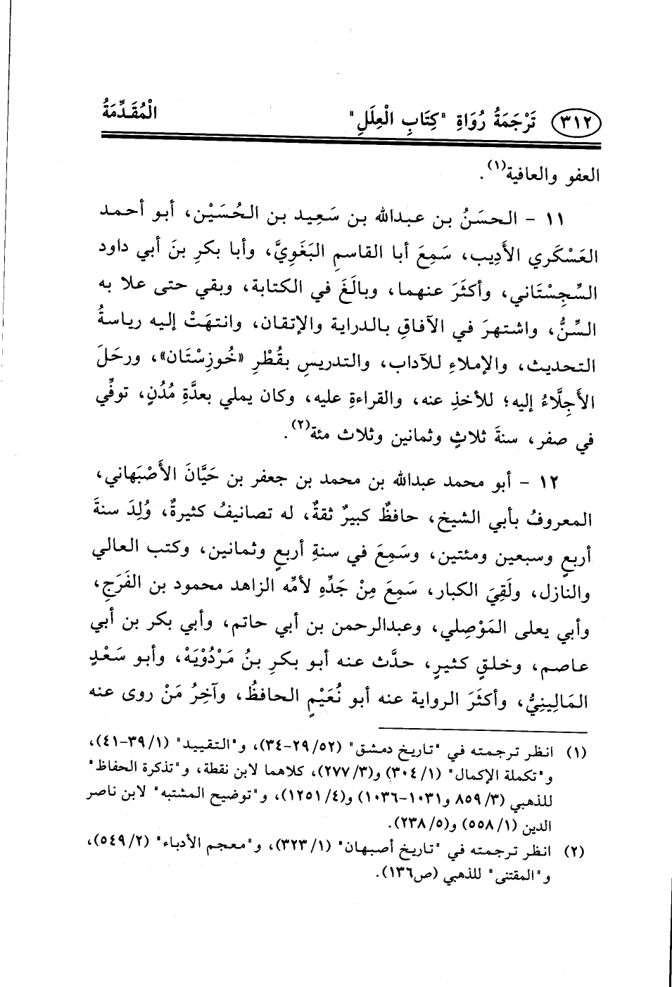 ١٢ - أبو محمد عبد الله بن محمد بن جعفر ابن حَيَّانَ الأَصْبَهاني، المعروفُ بأبي الشيخ، حافظٌ كبيرٌ ثقةٌ، له تصانيفُ كثيرةٌ، وُلِدَ سنةَ أربعٍ وسبعين ومئتين، وسَمِعَ في سنةِ أربعٍ وثمانين، وكتب العالي والنازل، ولَقِيَ الكبار، سَمِعَ مِنْ جَدِّهِ لأمِّه الزاهد محمود بن الفَرَجِ، وأبي يعلى المَوْصِلي، وعبد الرحمن بن أبي حاتم، وأبي بكر بن أبي عاصم، وخلقٍ كثيرٍ، حدَّث عنه أبو بكرِ بنُ مَرْدُوْيَهْ، وأبو سَعْدٍ المَالِينِيُّ، وأكثَرَ الرواية عنه أبو نُعَيْمٍ الحافظُ، وآخِرُ مَنْ روى عنه