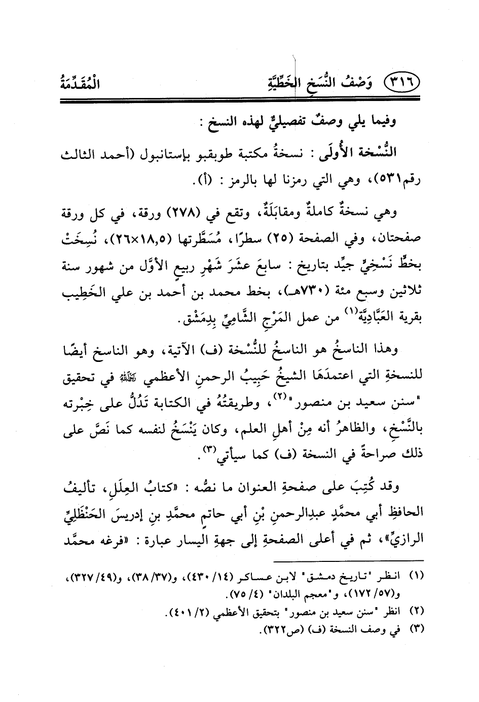 وهذا الناسخُ هو الناسخُ للنُّسْخة (ف) الآتية، وهو الناسخ أيضًا للنسخةِ التي اعتمدَهَا الشيخُ حَبِيبُ الرحمنِ الأعظمي _ح في تحقيق "سنن سعيد بن منصور" (٢) ، وطريقتُهُ في الكتابة تَدُلُّ على خِبْرته بالنَّسْخِ، والظاهرُ أنه مِنْ أهلِ العلم، وكان يَنْسَخُ لنفسه كما نَصَّ على ذلك صراحةً في النسخة (ف) كما سيأتي (٣) .