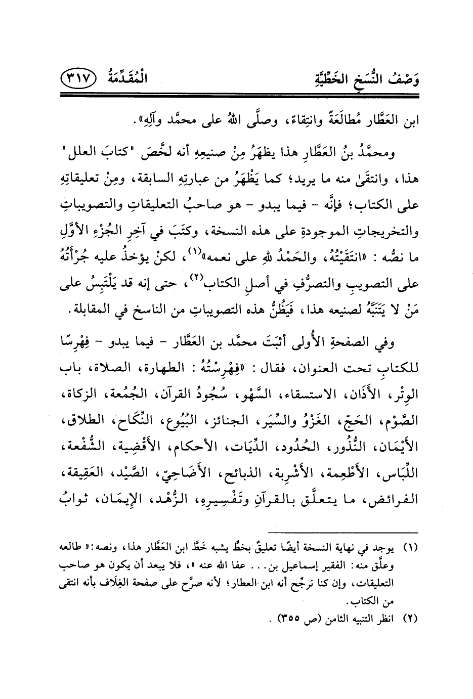 (١) يوجد في نهاية النسخة أيضًا تعليقٌ بخطٍّ يشبه خَطَّ ابن العَطَّار هذا، ونصه: «طالعه وعلَّق منه: الفقير إسماعيل ابن ... عفا الله عنه» ، فلا يبعد أن يكون هو صاحب التعليقات، وإن كنا نرجِّح أنه ابن العطار؛ لأنه صرَّح على صفحة الغِلَاف بأنه انتقى من الكتاب.