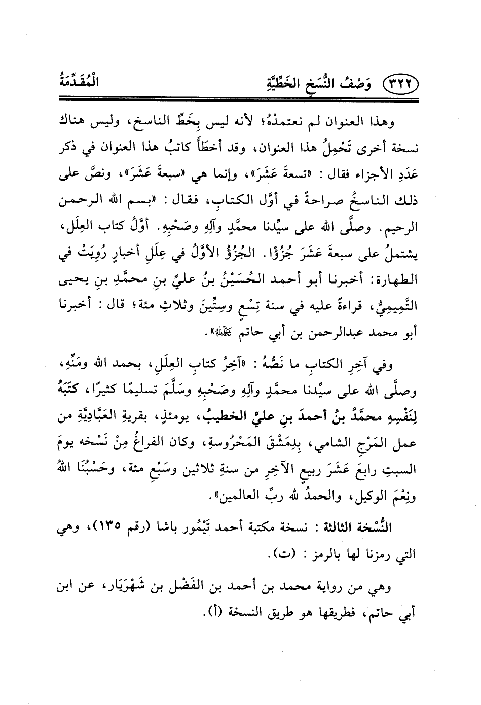 وهذا العنوان لم نعتمدْهُ؛ لأنه ليس بِخَطِّ الناسخ، وليس هناك نسخة أخرى تَحْمِلُ هذا العنوان، وقد أخطَأَ كاتبُ هذا العنوان في ذكر عَدَدِ الأجزاء فقال: «تسعةَ عَشَرَ» ، وإنما هي «سبعةَ عَشَرَ» ، ونصَّ على ذلك الناسخُ صراحةً في أوَّل الكتابِ، فقال: «بِسْمِ اللَّه الرَّحْمَنِ الرَّحِيم. وصلَّى اللَّهُ عَلَى سيِّدنا محمَّدٍ وآلِهِ وصَحْبِهِ. أوَّلُ كتاب العِلَل، يشتملُ عَلَى سبعةَ عَشَرَ جُزُؤًا. الجُزُؤُ الأوَّلُ فِي عِلَلِ أخبارٍ رُوِيَتْ في الطهارة: أخبرنا أبو أحمد الحُسَيْنُ ابنُ عليِّ بنِ محمَّدِ بنِ يحيى التَّمِيمِيُّ، قراءة عَلَيْهِ فِي سنة تِسْعٍ وسِتِّينَ وثلاثِ مئة؛ قال: أخبرنا أبو محمد عبد الرحمن بن أبي حاتم _ح» .
