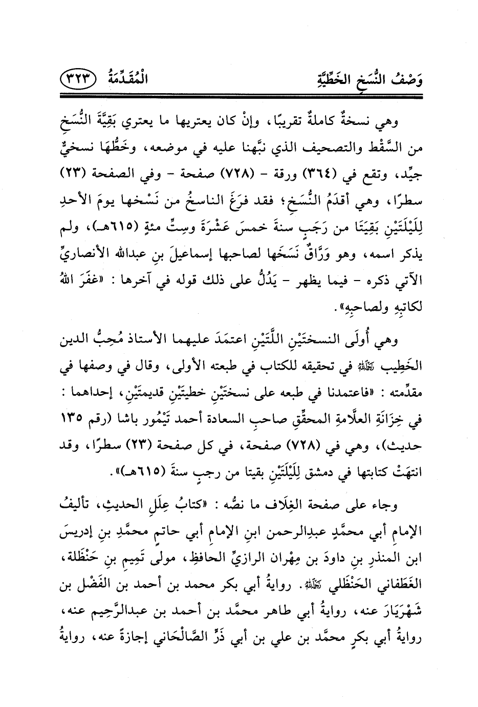 وهي أُولَى النسختَيْنِ اللَّتَيْنِ اعتمَدَ عليهما الأستاذ مُحِبُّ الدين الخَطِيب _ح في تحقيقه للكتاب في طبعته الأولى، وقال في وصفها في مقدِّمته: «فاعتمدنا في طبعه على نسختَيْنِ خطيتَيْنِ قديمتَيْنِ، إحداهما: في خِزَانَةِ العلَاّمةِ المحقِّقِ صاحبِ السعادة أحمد تَيْمُور باشا (رقم ١٣٥ حديث) ، وهي في (٧٢٨) صفحة، في كل صفحة (٢٣) سطرًا، وقد انتهَتْ كتابتها في دمشق لِلَيْلَتَيْنِ بقيتا من رجبٍ سنةَ (٦١٥هـ) » .