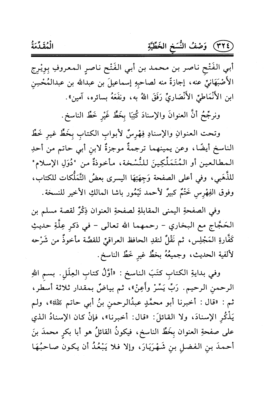وفي بدايةِ الكتابِ كتَبَ الناسخ: «أوَّلُ كتابِ العِلَلِ. بسمِ اللهِ الرحمنِ الرحيم. رَبِّ يَسِّرْ وأَعِنْ» ، ثم بياضٌ بمقدار ثلاثة أسطر، ثم: «قال: أخبرنا أبو محمَّدٍ عبدُالرحمنِ بنُ أبي حاتم _ح» ، ولم يَذْكُرِ الإسنادَ، ولا القائلَ: «قال: أخبرنا» ، فإنْ كان الإسنادُ الذي على صفحةِ العنوان بِخَطِّ الناسخ، فيكونُ القائلُ هو أبا بكرٍ محمدَ بنَ أحمدَ بنِ الفضلِ بنِ شَهْرَيَارَ، وإلا فلا يَبْعُدُ أن يكون صاحبُهَا