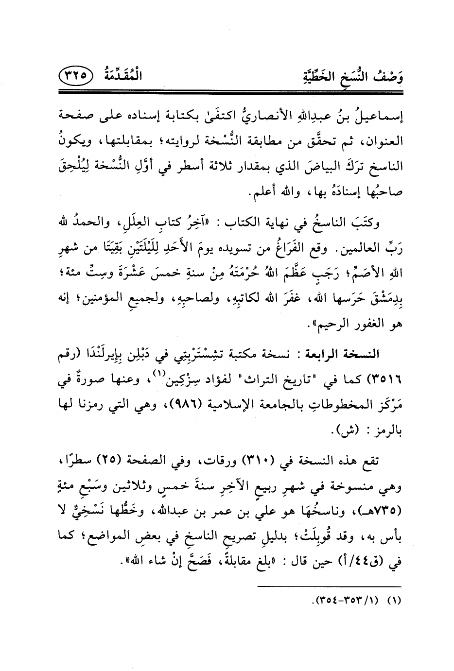 تقع هذه النسخة في (٣١٠) ورقات، وفي الصفحة (٢٥) سطرًا، وهي منسوخة في شهرِ ربيعٍ الآخِرِ سنةَ خمسٍ وثلاثين وسَبْعِ مئةٍ (٧٣٥هـ) ، وناسخُهَا هو علي بن عمر بن عبد الله، وخَطُّها نَسْخِيٌّ لا بأس به، وقد قُوبِلَتْ؛ بدليلِ تصريحِ الناسخِ في بعضِ المواضع؛ كما في (ق٤٤/أ) حين قال: «بلغ مقابلةً، فَصَحَّ إنْ شاء الله» .