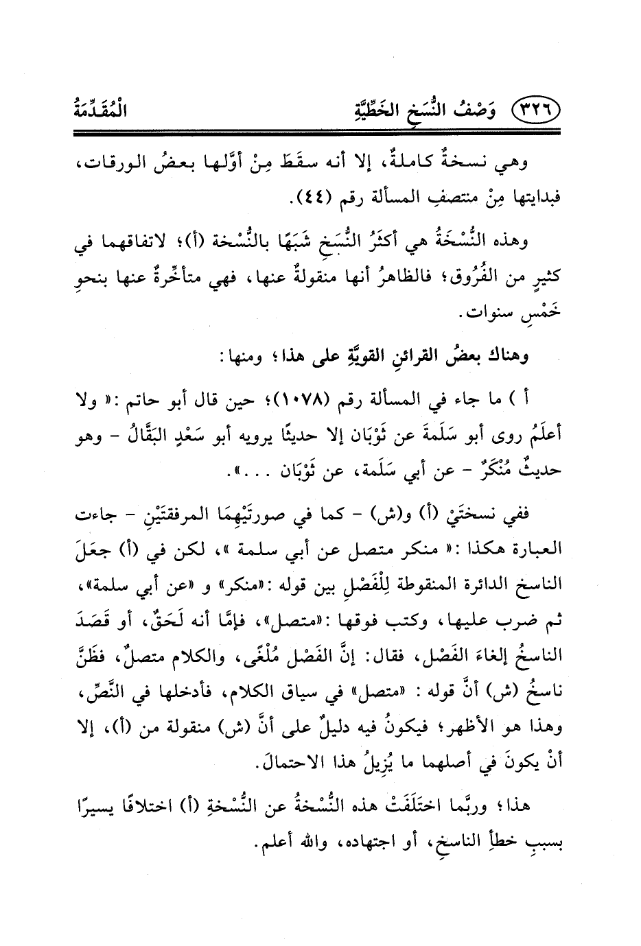 وهي نسخةٌ كاملةٌ، إلا أنه سقَطَ مِنْ أوَّلها بعضُ الورقات، فبدايتها مِنْ منتصفِ المسألة رقم (٤٤) .