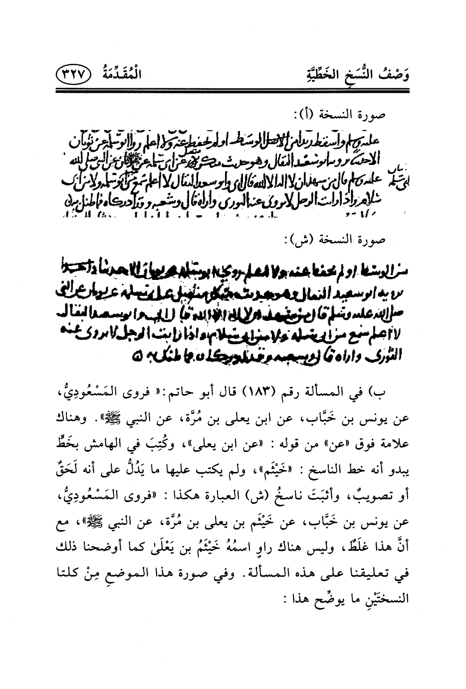 ب) في المسألة رقم (١٨٣) قال أبو حاتم: «فَرَوَى المَسْعُودِيُّ، عَنْ يُونُسَ بْنِ خَبَّاب، عَنِ ابْنِ يَعْلَى بْنِ مُرَّة، عن النبي (ص) » . وهناك علامة فوق «عن» من قوله: «عن ابن يعلى» ، وكُتِبَ في الهامش بخَطٍّ يبدو أنه خط الناسخ: «خَيْثَم» ، ولم يكتب عليها ما يَدُلُّ على أنه لَحَقٌ أو تصويبٌ، وأثبَتَ ناسخُ (ش) العبارة هكذا: «فَرَوَى المَسْعُودِيُّ، عَنْ يُونُسَ بْنِ خَبَّاب، عن خَيْثَم بن يَعْلَى بْنِ مُرَّة، عَنِ النَّبِيِّ (ص) » ، مع أنَّ هذا غلَطٌ، وليس هناك راوٍ اسمُهُ خَيْثَمُ بن يَعْلَى كما أوضحنا ذلك في تعليقنا على هذه المسألة. وفي صورة هذا الموضعِ مِنْ كلتا النسختَيْنِ ما يوضِّح هذا: