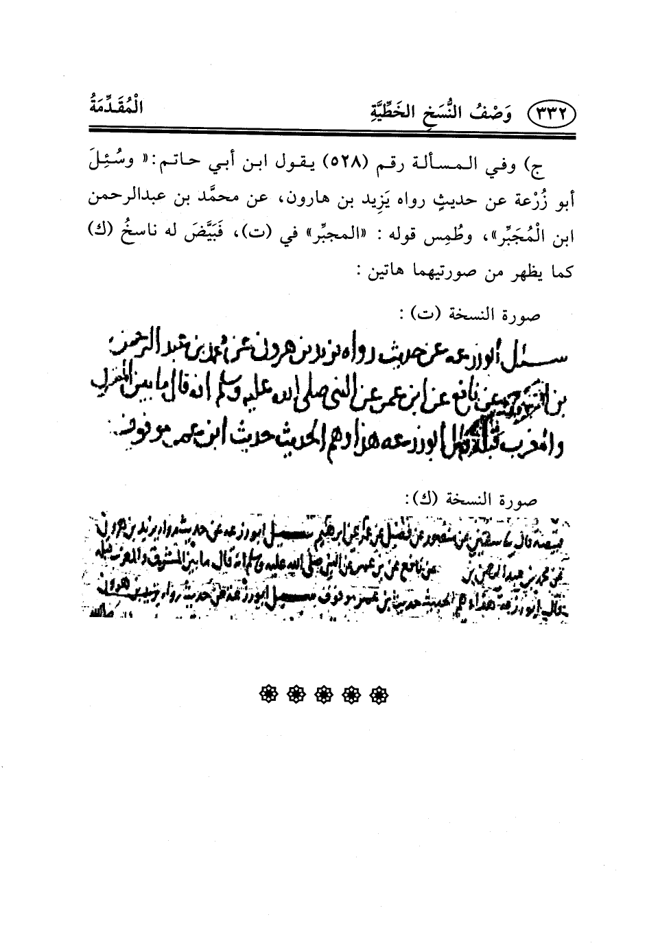 ج) وفي المسألة رقم (٥٢٨) يقول ابن أبي حاتم: «وسُئِلَ أَبُو زُرْعة عَنْ حديثٍ رواه يَزِيد ابن هارون، عن محمَّد بن عبد الرحمن بن الْمُجَبِّر» ، وطُمِس قوله: «المجبِّر» في (ت) ، فَبَيَّضَ له ناسخُ (ك) كما يظهر من صورتيهما هاتين: