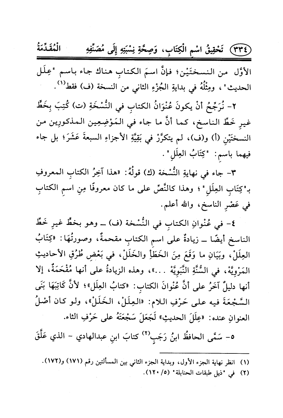 ٢- نُرَجِّحُ أنْ يكونَ عُنْوَانُ الكتابِ في النُّسْخَةِ (ت) كُتِبَ بِخَطٍّ غيرِ خَطِّ الناسخ، كما أنَّ ما جاء في المَوْضِعِين المذكورِين من النسختَيْنِ (أ) و (ف) ، لم يتكرَّرْ في بَقِيَّةِ الأجزاءِ السبعةَ عَشَرَ؛ بل جاء فيهما باسمِ: "كِتَابُ العِلَلِ".