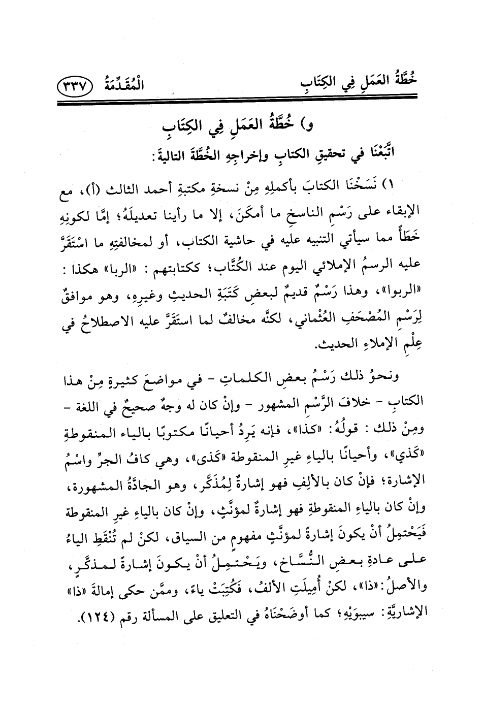 ونحوُ ذلك رَسْمُ بعضِ الكلماتِ - في مواضعَ كثيرةٍ مِنْ هذا الكتابِ - خلافَ الرَّسْمِ المشهور - وإنْ كان له وجهٌ صحيحٌ في اللغة - ومِنْ ذلك: قولُهُ: «كذا» ، فإنه يَرِدُ أحيانًا مكتوبًا بالياء المنقوطةِ «كَذي» ، وأحيانًا بالياءِ غيرِ المنقوطة «كَذى» ، وهي كافُ الجرِّ واسْمُ الإشارة؛ فإنْ كان بالألِفِ فهو إشارةٌ لِمُذَكَّر، وهو الجادَّةُ المشهورة، وإنْ كان بالياءِ المنقوطةِ فهو إشارةٌ لمؤنَّثٍ، وإنْ كان بالياءِ غيرِ المنقوطة فَيَحْتمِلُ أنْ يكونَ إشارةً لمؤنَّثٍ مفهومٍ من السياق، لكنْ لم تُنْقَطِ الياءُ على عادةِ بعضِ النُّسَّاخ، ويَحْتمِلُ أنْ يكونَ إشارةً لمذكَّرٍ، والأصلُ: «ذا» ، لكنْ أُمِيلَتِ الألفُ، فَكُتِبَتْ ياءً، وممَّن حكى إمالةَ «ذا» الإشاريَّةِ: سيبوَيْهِ؛ كما أوضَحْنَاهُ في التعليق على المسألة رقم (١٢٤) .