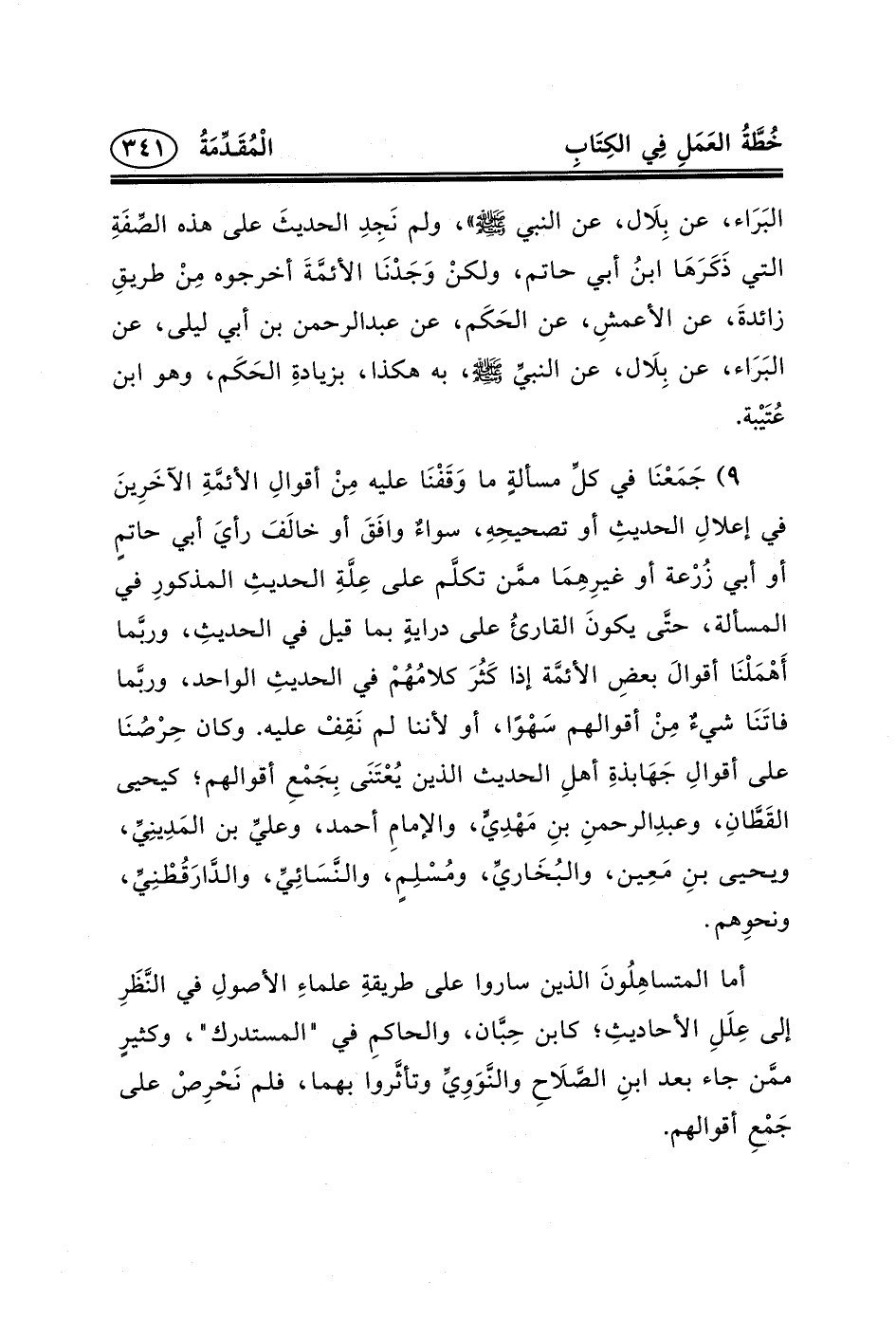 عَن البَرَاء، عَن بِلَال، عَنِ النبي (ص) » ، ولم نَجِدِ الحديثَ على هذه الصِّفَةِ التي ذَكَرَهَا ابنُ أبي حاتم، ولكنْ وَجَدْنَا الأئمَّةَ أخرجوه مِنْ طريقِ زائدةَ، عَن الأعمشِ، عَن الحَكَم، عَنْ عبد الرحمن بْنِ أَبِي لَيْلَى، عَن البَرَاء، عن بِلَال، عن النبيِّ (ص) ، به هكذا، بزيادةِ الحَكَم، وهو ابن عُتَيْبة.