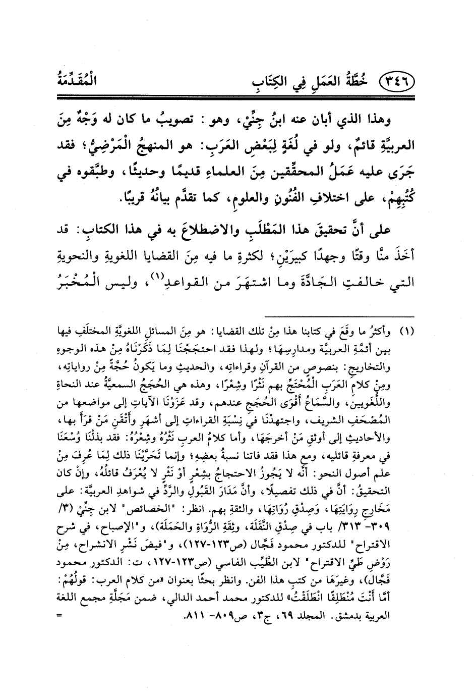 (١) وأكثرُ ما وقَعَ في كتابنا هذا مِنْ تلك القضايا: هو مِنَ المسائلِ اللغويَّةِ المختلَفِ فيها بين أئمَّةِ العربيَّة ومدارِسِهَا؛ ولهذا فقد احتجَجْنَا لِمَا ذَكَرْنَاهُ مِنْ هذه الوجوهِ والتخاريجِِ: بنصوصٍ من القرآنِ وقراءاتِه، والحديثِ وما يَكونُ حُجَّةً مِنْ رواياتِه، ومِنْ كلامِ العَرَبِ الْمُحْتَجِّ بهم نَثْرًا وشِعْرًا، وهذه هي الحُجَجُ السمعيَّةُ عند النحاةِ واللُّغَويين، والسَّمَاعُ أَقْوَى الحُجَجِ عندهم، وقد عَزَوْنَا الآياتِ إلى مواضعها من المُصْحَفِ الشريف، واجتهدْنَا في نِسْبَةِ القراءاتِ إلى أشهَرِ وأَتْقَنِ مَنْ قرَأَ بها، والأحاديثِ إلى أوثقِ مَنْ أخرجَهَا، وأما كلامُ العربِ نَثْرُهُ وشِعْرُهُ: فقد بذلْنَا وُسْعَنَا في معرفةِ قائليه، ومع هذا فقد فاتنا نسبةُ بعضِهِ؛ وإنما تَحَرَّيْنَا ذلك لِمَا عُرِفَ مِنْ علم أصول النحو: أنَّه لا يَجُوزُ الاحتجاجُ بشِعْرٍ أوْ نَثْرٍ لا يُعْرَفُ قائلُهُ، وإنْ كان التحقيقُ: أنَّ في ذلك تفصيلاً، وأنَّ مَدَارَ القَبُولِ والرَّدِّ في شواهدِ العربيَّة: على مَخَارِجِ رِوَايَتِهَا، وَصِدْقِ رُوَاتِهَا، والثقةِ بهم. انظر: "الخصائص" لابن جِنِّيْ (٣/٣٠٩- ٣١٣/ باب في صِدْقِ النَّقَلَة، وثِقَةِ الرُّوَاةِ والحَمَلَة) ، و"الإصباح، في شرح الاقتراح" للدكتور محمود فَجَّال (ص١٢٣-١٢٧) ، و"فيضَ نَشْرِ الانشراح، مِنْ رَوْضِ طَيِّ الاقتراح" لابن الطَّيِّب الفاسي (ص١٢٣-١٢٧، ت: الدكتور محمود فَجَّال) ، وغيرَهَا من كتبِ هذا الفن..وانظر بحثًا بعنوان «من كلام العرب: قولُهُمْ: أمَّا أَنْتَ مُنْطَلِقًا انْطَلَقْتُ» للدكتور محمد أحمد الدالي، ضمن مَجَلَّةِ مجمع اللغة العربية بدمشق. المجلد ٦٩، ج٣، ص٨٠٩- ٨١١.