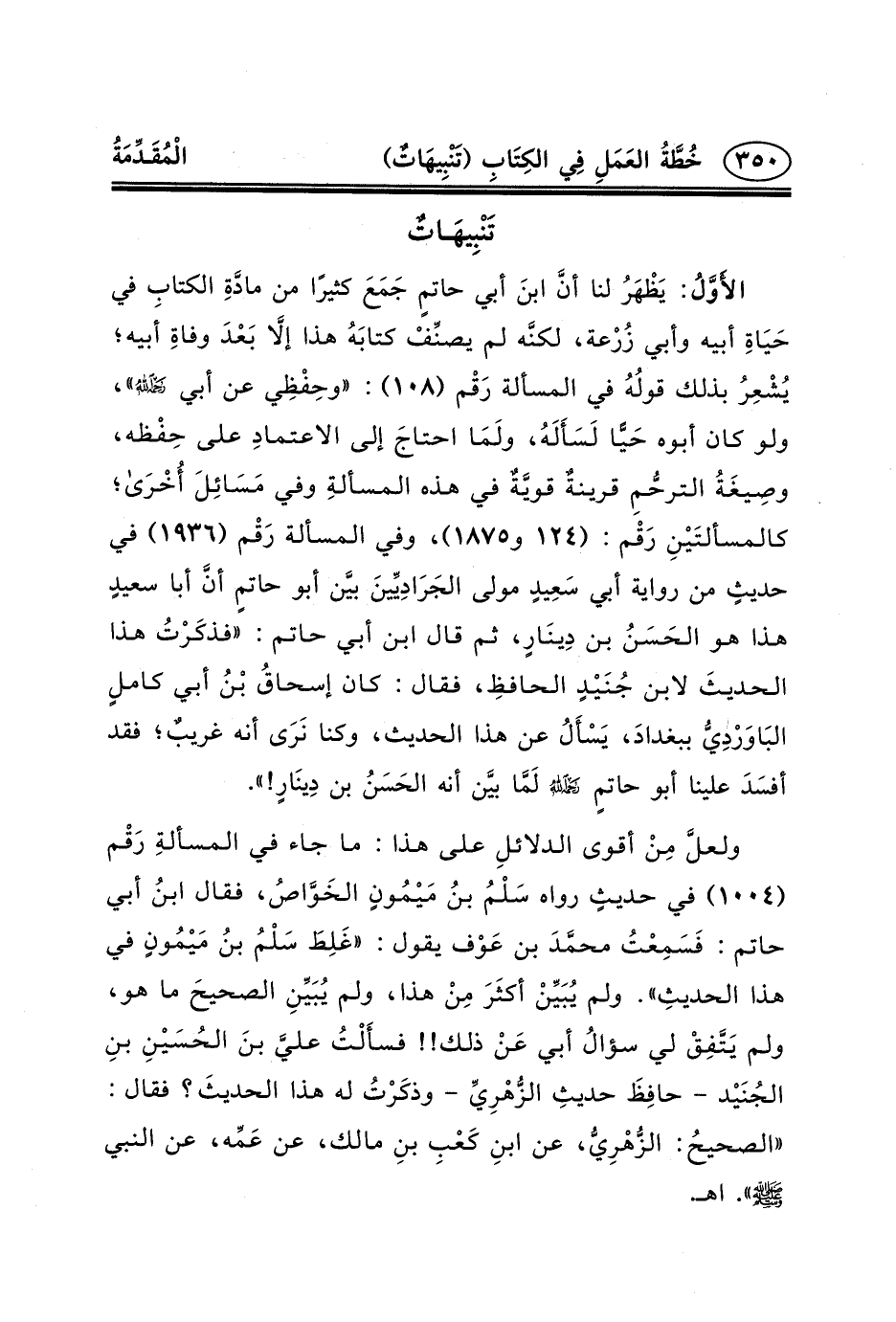 الأَوَّلُ: يَظْهَرُ لنا أنَّ ابنَ أبي حاتمٍ جَمَعَ كثيرًا من مادَّةِ الكتابِ في حَيَاةِ أبيه وأبي زُرْعة، لكنَّه لم يصنِّفْ كتابَهُ هذا إلَاّ بَعْدَ وفاةِ أبيه؛ يُشْعِرُ بذلك قولُهُ في المسألة رَقْم (١٠٨) : «وحِفْظِي عن أبي _ح» ، ولو كان أبوه حَيًّا لَسَأَلَهُ، ولَمَا احتاجَ إلى الاعتمادِ على حِفْظه، وصِيغَةُ الترحُّمِ قرينةٌ قويَّةٌ في هذه المسألةِ وفي مَسَائِلَ أُخْرَى؛ كالمسألتَيْنِ رَقْم: (١٢٤ و١٨٧٥) ، وفي المسألة رَقْم (١٩٣٦) في حديثٍ من رواية أبي سَعِيدٍ مولى الجَرَادِيِّينَ بيَّن أبو حاتمٍ أنَّ أبا سعيدٍ هَذَا هو الحَسَنُ بْن دِينَارٍ، ثم قال ابن أبي حاتم: «فذكَرْتُ هَذَا الحديثَ لابْنِ جُنَيْدٍ الحافظِ، فَقَالَ: كَانَ إسحاقُ بْنُ أَبِي كاملٍ البَاوَرْدِيُّ ببغدادَ، يَسْأَلُ عَنْ هَذَا الْحَدِيث، وكنا نَرَى أَنَّهُ غريبٌ؛ فقد أفسَدَ علينا أَبُو حاتمٍ _ح لَمَّا بيَّن أنه الحَسَنُ ابن دِينَارٍ!» .