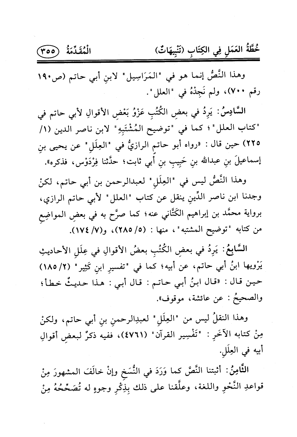 السَّابِعُ: يَرِدُ في بعضِ الكُتُبِ بعضُ الأقوالِ في عِلَلِ الأحاديثِ يَرْويها ابنُ أبي حاتم، عن أبيه؛ كما في "تفسيرِ ابنِ كَثِير" (٢/١٨٥) حين قال: «قال ابنُ أبي حاتم: قَالَ أَبِي: هَذَا حديثٌ خَطَأٌ؛ والصحيحُ: عن عائشة، موقوف» .