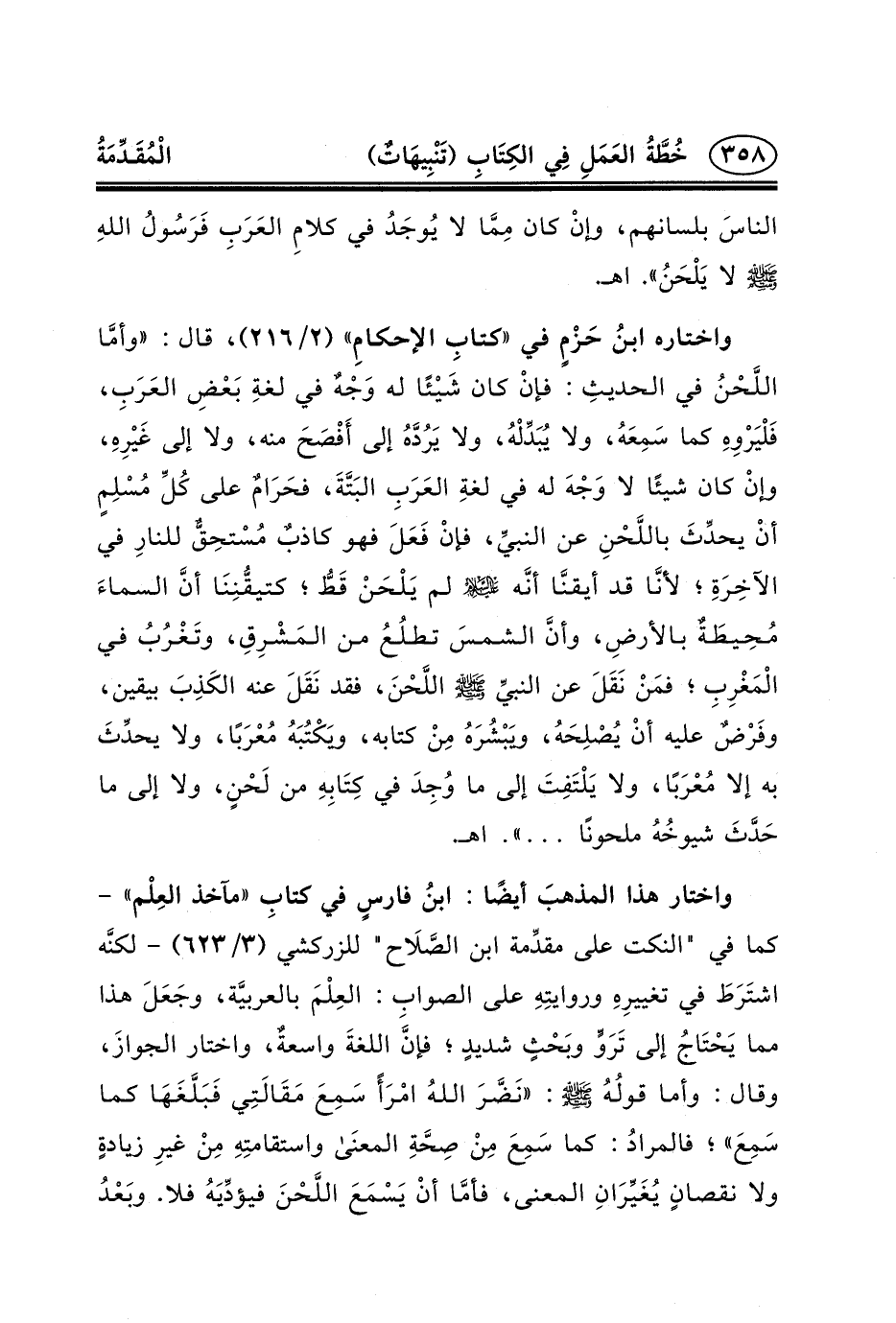واختاره ابنُ حَزْمٍ في «كتابِ الإحكامِ» (٢/٢١٦) ، قال: «وأمَّا اللَّحْنُ في الحديثِ: فإنْ كان شَيْئًا له وَجْهٌ في لغةِ بَعْضِ العَرَبِ، فَلْيَرْوِهِ كما سَمِعَهُ، ولا يُبَدِّلْهُ، ولا يَرُدَّهُ إلى أَفْصَحَ منه، ولا إلى غَيْرِهِ، وإنْ كان شيئًا لا وَجْهَ له في لغةِ العَرَبِ البَتَّةَ، فحَرَامٌ على كُلِّ مُسْلِمٍ أنْ يحدِّثَ باللَّحْنِ عن النبيِّ، فإنْ فَعَلَ فهو كاذبٌ مُسْتحِقٌّ للنارِ في الآخِرَةِ؛ لأنَّا قد أيقنَّا أنَّه _ج لم يَلْحَنْ قَطُّ؛ كتيقُّنِنَا أنَّ السماءَ مُحِيطَةٌ بالأرضِ، وأنَّ الشمسَ تطلُعُ من المَشْرِقِ، وتَغْرُبُ في الْمَغْرِبِ؛ فمَنْ نَقَلَ عن النبيِّ (ص) اللَّحْنَ، فقد نَقَلَ عنه الكَذِبَ بيقين، وفَرْضٌ عليه أنْ يُصْلِحَهُ، ويَبْشُرَهُ مِنْ كتابه، ويَكْتُبَهُ مُعْرَبًا، ولا يحدِّثَ به إلا مُعْرَبًا، ولا يَلْتَفِتَ إلى ما وُجِدَ في كِتَابِهِ من لَحْنٍ، ولا إلى ما حَدَّثَ شيوخُهُ ملحونًا ... » . اهـ.