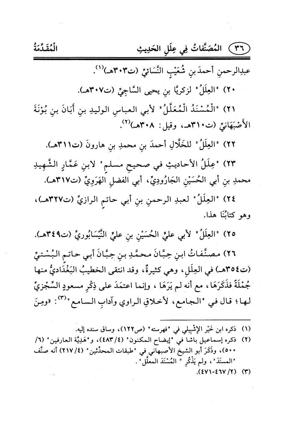 ٢٦) مصنَّفاتُ ابنِ حِبَّانَ محمَّدِ بنِ حِبَّانَ أبي حاتمٍ البُسْتيِّ (ت٣٥٤هـ) في العِلَلِ، وهي كثيرةٌ، وقد انتقى الخطيبُ البَغْدَاديُّ منها جُمْلَةً فذَكَرَهَا، مع أنه لم يَرَهَا، وإنما اعتمَدَ على ذِكْرِ مسعودٍ السِّجْزيِّ لها؛ قال في "الجامع، لأخلاقِ الراوي وآدابِ السامع" (٣) : «ومِنَ