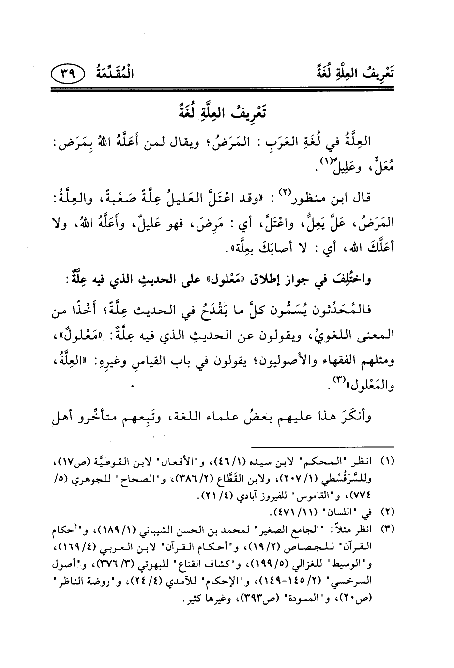 فالمُحَدِّثون يُسَمُّون كلَّ ما يَقْدَحُ في الحديث عِلَّةً؛ أَخْذًا من المعنى اللغويِّ، ويقولون عن الحديثِ الذي فيه عِلَّةٌ: «مَعْلولٌ» ، ومثلهم الفقهاء والأصوليون؛ يقولون في باب القياسِ وغيرِهِ: «العِلَّةُ، والمَعْلول» (٣) .