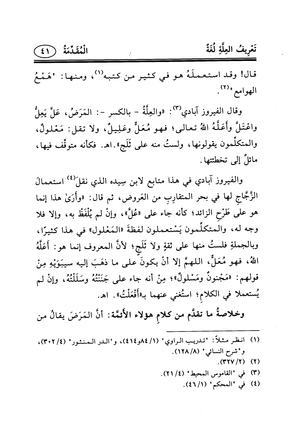 وقال الفيروز آبادي (٣) : «والعِلَّةُ - بالكسر -: المَرَضُ، عَلَّ يَعِلُّ واعْتَلَّ وأَعَلَّهُ اللهُ تعالى؛ فهو مُعَلٌّ وعَلِيلٌ، ولا تقل: مَعْلولٌ، والمتكلِّمون يقولونها، ولستُ منه على ثَلَج» . اهـ. فكأنه متوقِّف فيها، مائلٌ إلى تخطئتها.