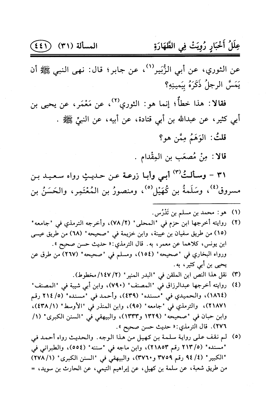 (١) ، عَنِ الثَّوْرِيِّ، عَنْ أَبِي الزُّبَير (٢) ، عَنْ جَابِرٍ؛ قَالَ: نَهَى النَّبِيُّ (ص) أَنْ يَمَسَّ الرجلُ ذَكَرَهُ بِيَمينِهِ؟