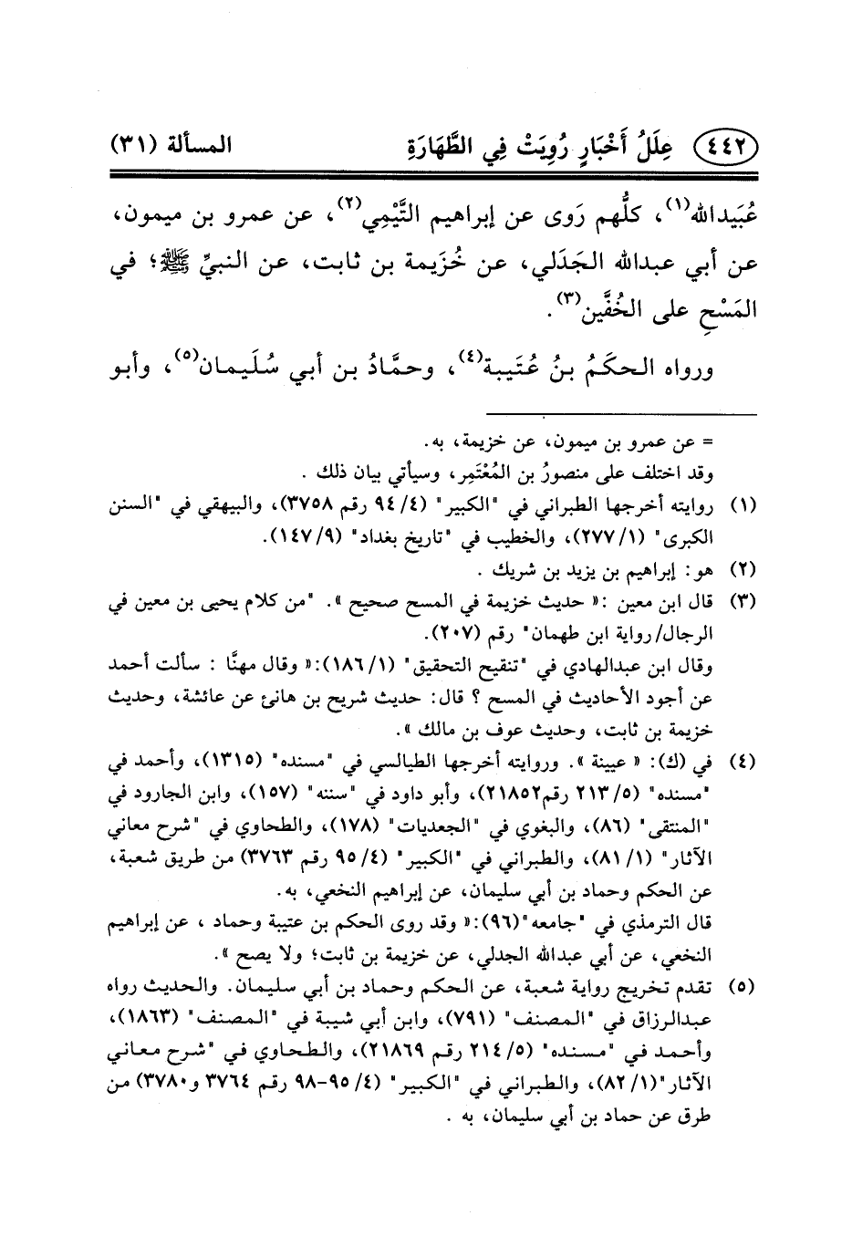عُبَيدالله (١) ، كلُّهم رَوى عَنْ إِبْرَاهِيمَ التَّيْمِي (٢) ، عن عمرو ابن ميمون، عن أبي عبد الله الجَدَلي، عَن خُزَيمة بْن ثابت، عن النبيِّ (ص) ؛ فِي المَسْحِ عَلَى الخُفَّين (٣) .