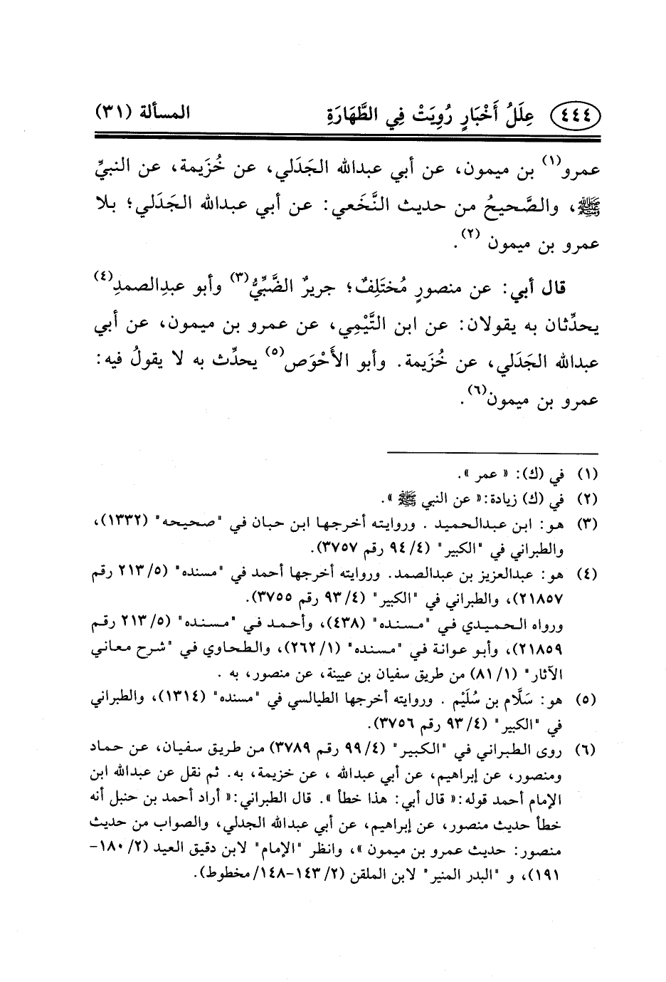 (٦) روى الطبراني في "الكبير" (٤/٩٩ رقم ٣٧٨٩) من طريق سفيان، عن حماد ومنصور، عن إبراهيم، عن أبي عبد الله، عن خزيمة، به. ثم نقل عن عبد الله ابن الإمام أحمد قوله: «قَالَ أَبِي: هَذَا خَطَأٌ» . قَالَ الطبراني: «أراد أحمد بن حنبل أنه خطأ حديث منصور، عن إبراهيم، عن أبي عبد الله الجدلي، والصواب من حديث منصور: حديث عمرو بن ميمون» ، وانظر "الإمام" لابن دقيق العيد (٢/١٨٠-١٩١) ، و "البدر المنير" لابن الملقن (٢/١٤٣-١٤٨/مخطوط) .