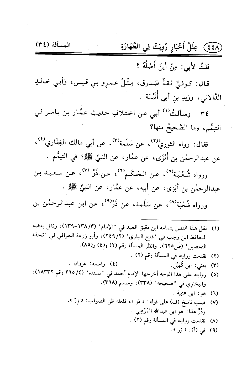٣٤ - وسألتُ (١) أَبِي عَن اختلافِ حديثِ عمَّار بْن ياسر فِي التيمُّم، وما الصَّحيحُ منها؟